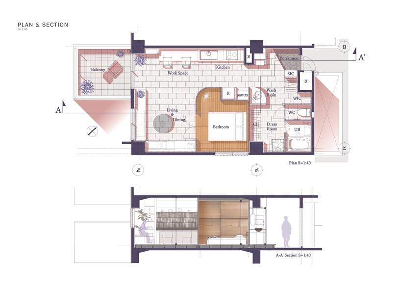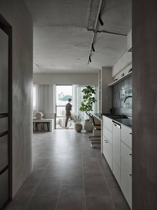 基本网格是由5.4m×6.3m的单元组成的钢筋混凝土刚架。地板被拆除了半跨,直到入口,只留下一条浮动的进场走廊。其余1.5个单元包含在私人宿舍内,从那里延伸出1/4个单元(2.7米x 3.1米)的阳台显然是为私人宿舍内的室内使用而设计的。这个豪华的方法和阳台位于相对的两侧,是现有空间的主要吸引力,充分发挥了将繁华的东京环境转化为丰富生活体验的功能。