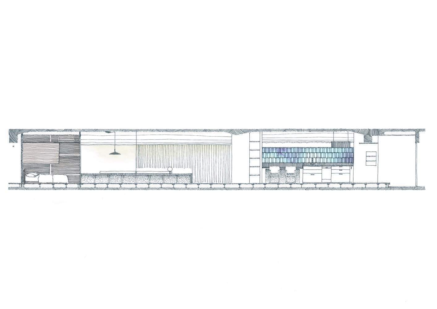 厨房和工作空间相邻放置,保持动态关系,并沿着连接阳台和入口的墙壁放置。新西兰厄斯金湖(Lake Erskine)美丽的水面是我们旅行中难忘的地方,它以湿挤压瓷砖的使用为代表,让从阳台进入的丰富阳光到达入口大门。瓷砖上的釉料由粗糙的熟料土和各种金属粉末混合而成,以不同的方式反射光线,在穿过房子时创造出美丽的序列。