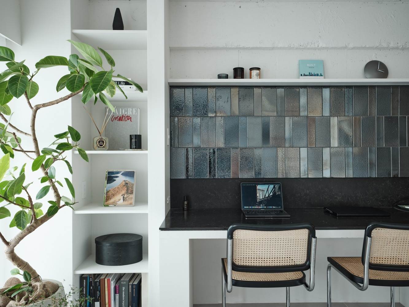 The kitchen and workspace were placed adjacent to each other, maintaining a dynamic relationship, and positioned along the wall connecting the balcony to the entrance. The beautiful water surface of Lake Erskine in New Zealand, a memorable spot from our travels, was represented by the usage of wet extruded tiles, allowing the rich sunlight entering from the balcony to reach the entrance gate. Tiles with a glaze made from rough chamotte soil mixed with various metal powders reflect light in different ways, creating a beautiful sequence as one walks through the house.