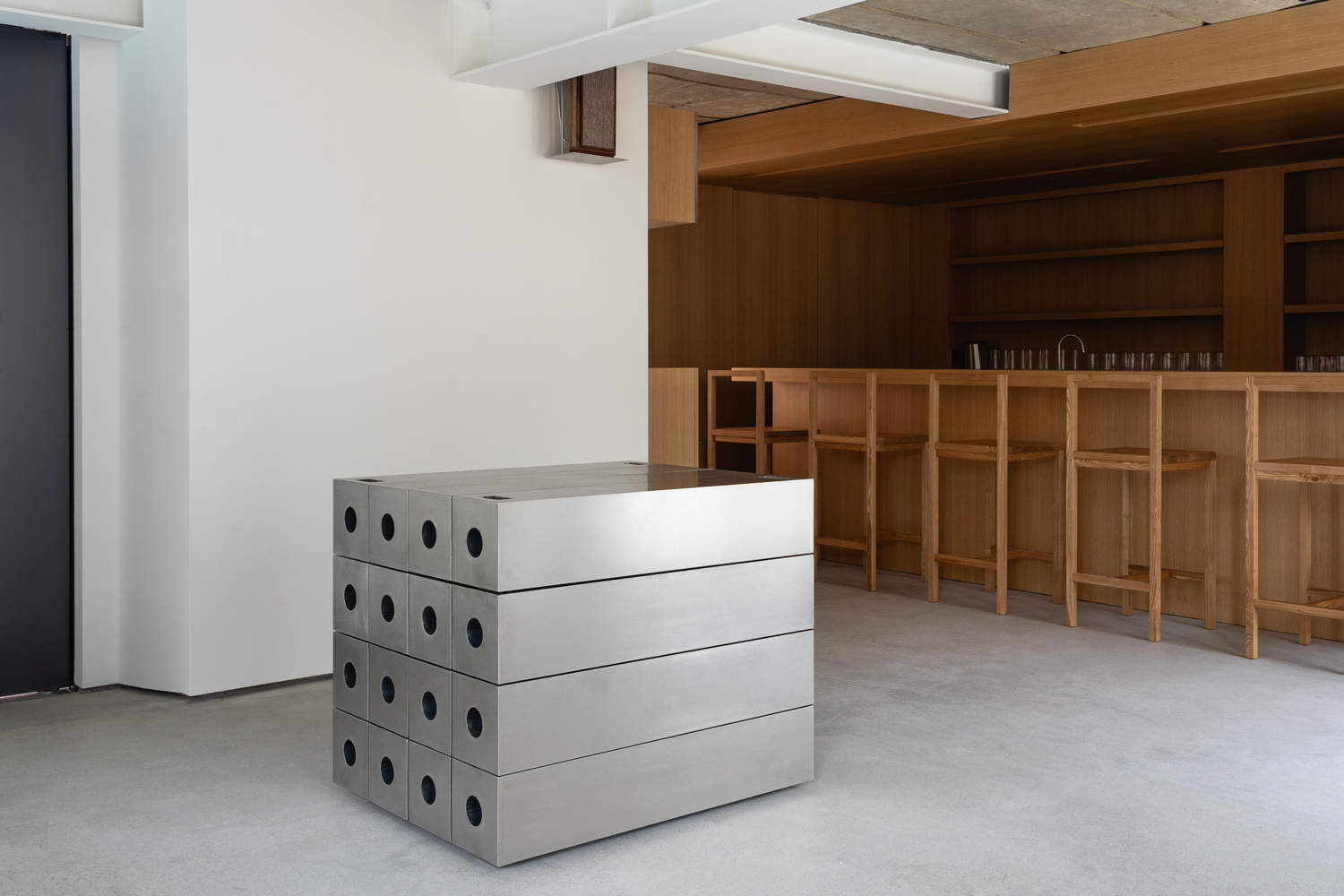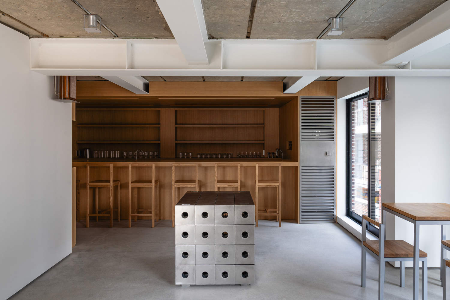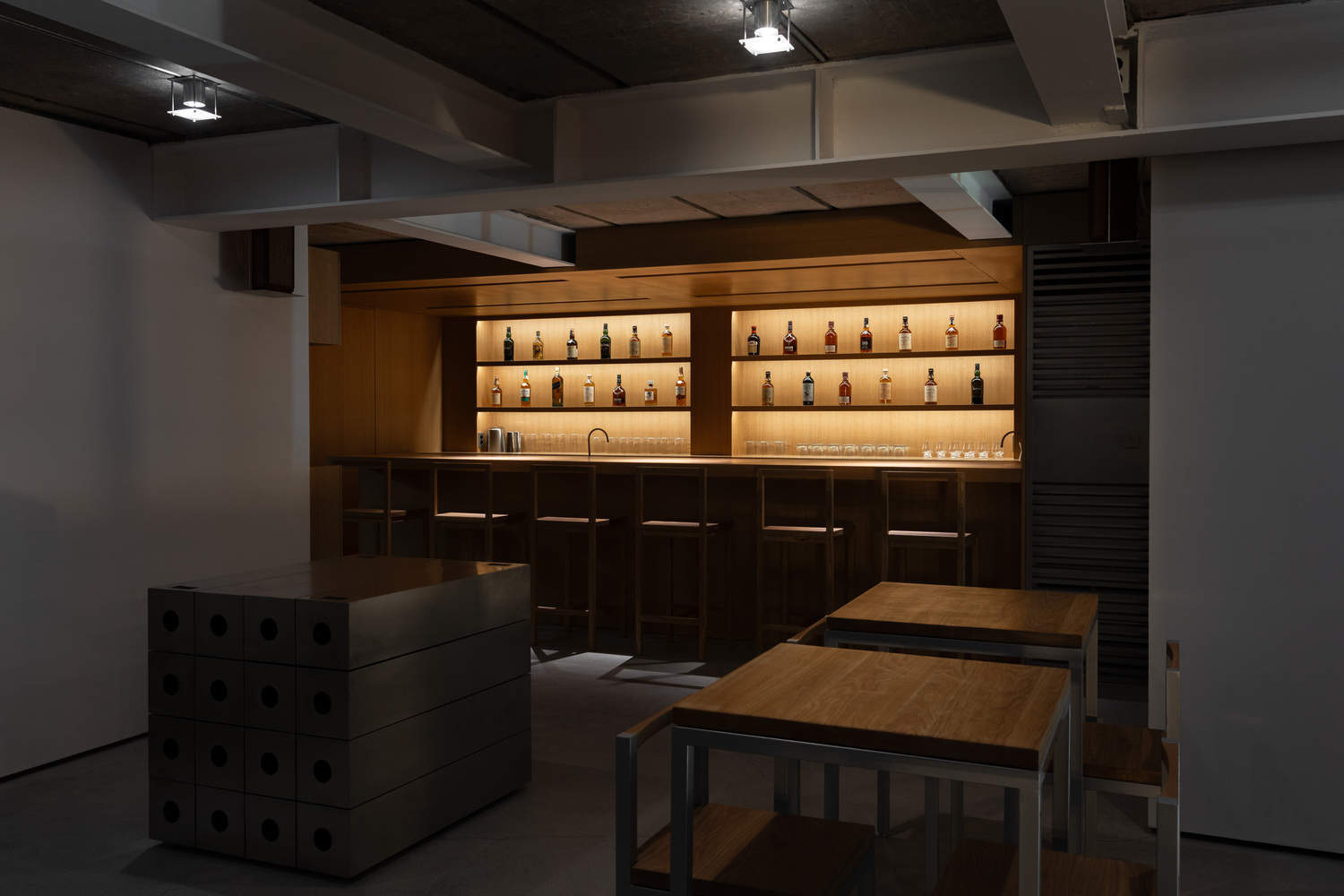 The space was originally used as a house constructed with load-bearing walls, but its function changed with the introduction of a steel structure. By retaining the original ceiling and floor, the space naturally reveals its past and traces of time. The white-painted steel structure and the newly designed walls contrast with the existing ceiling and floor, allowing visitors to sense how the space has transformed. The whisky bar, made of oak, represents the culmination of this transformation and stands as a symbol of the space.