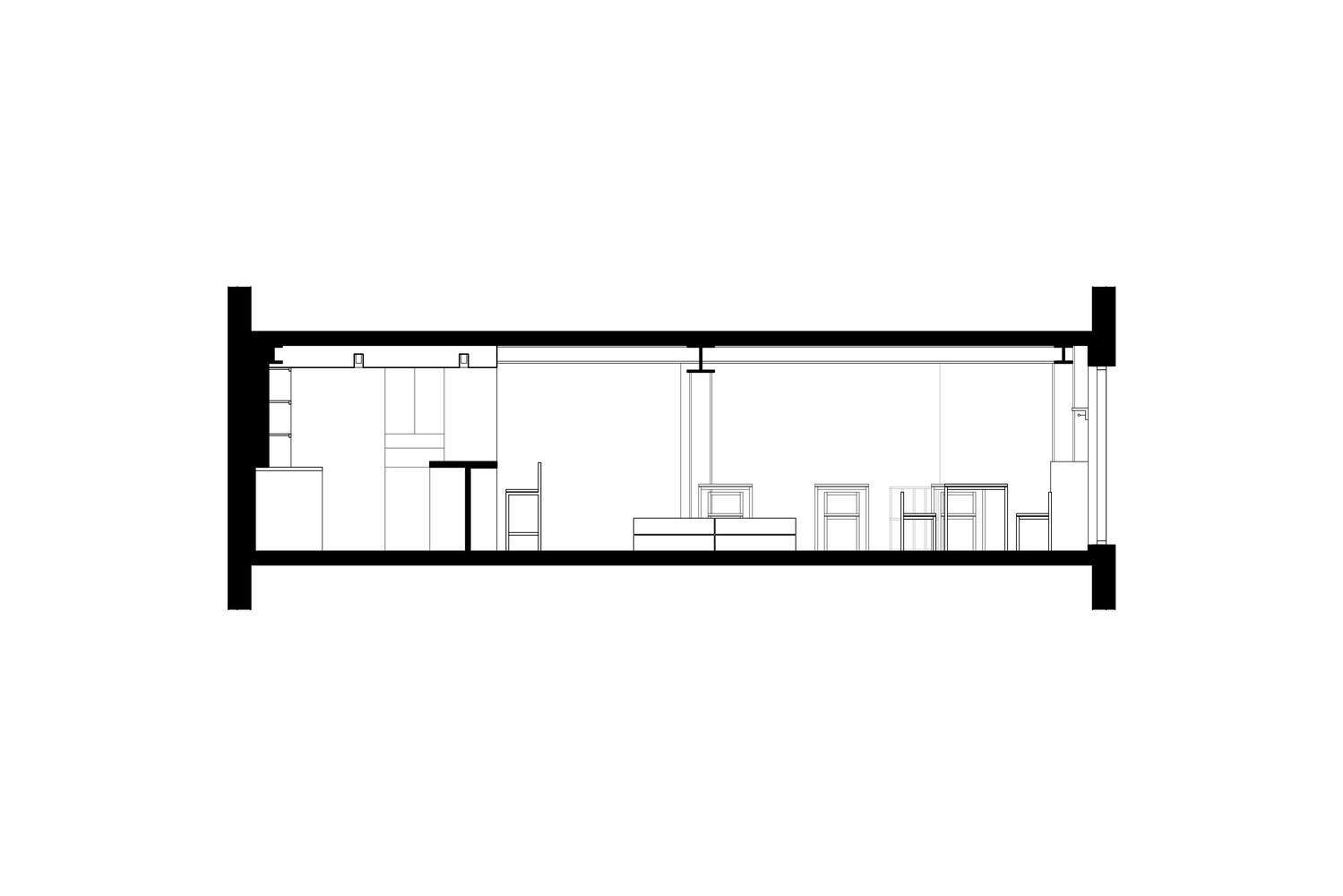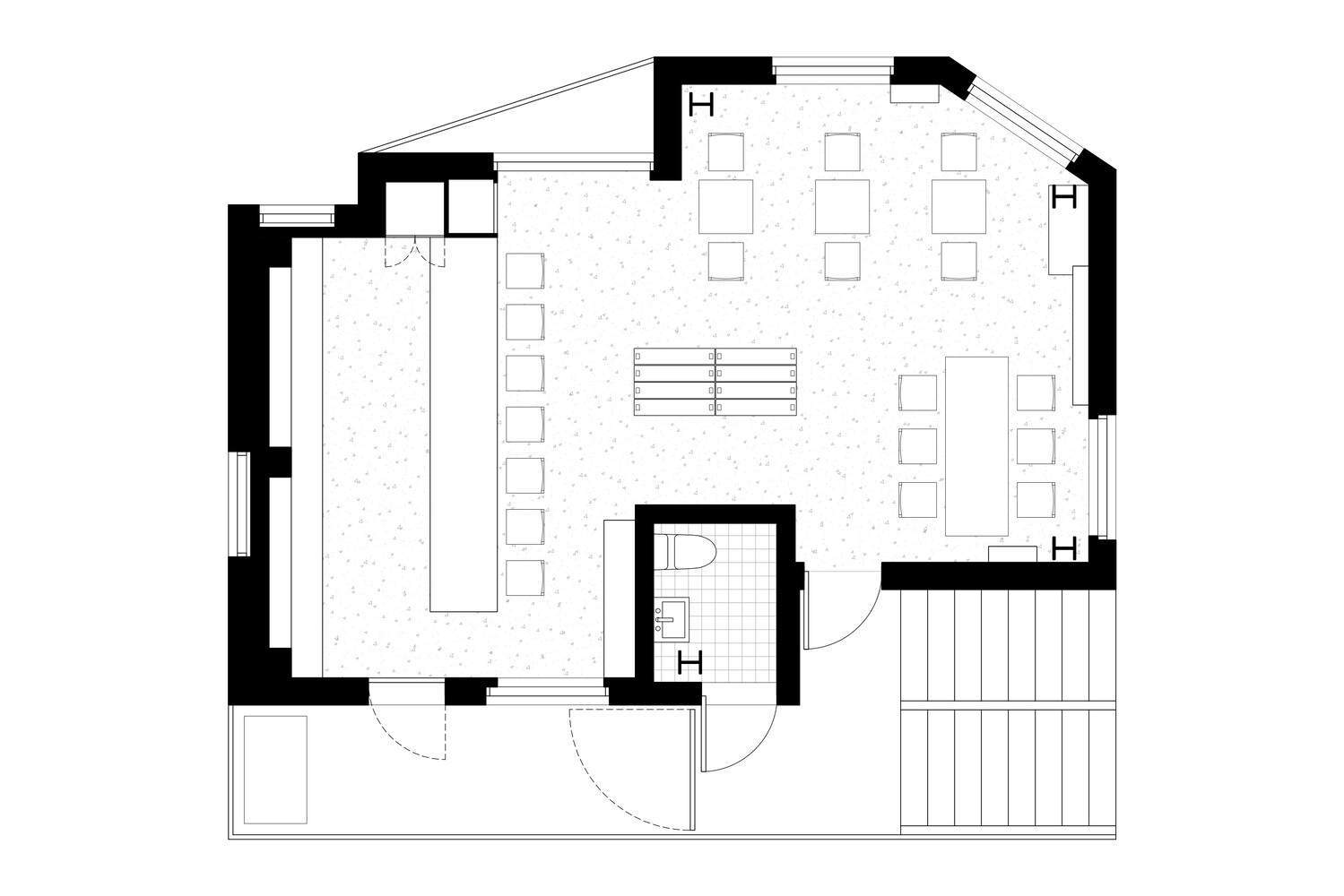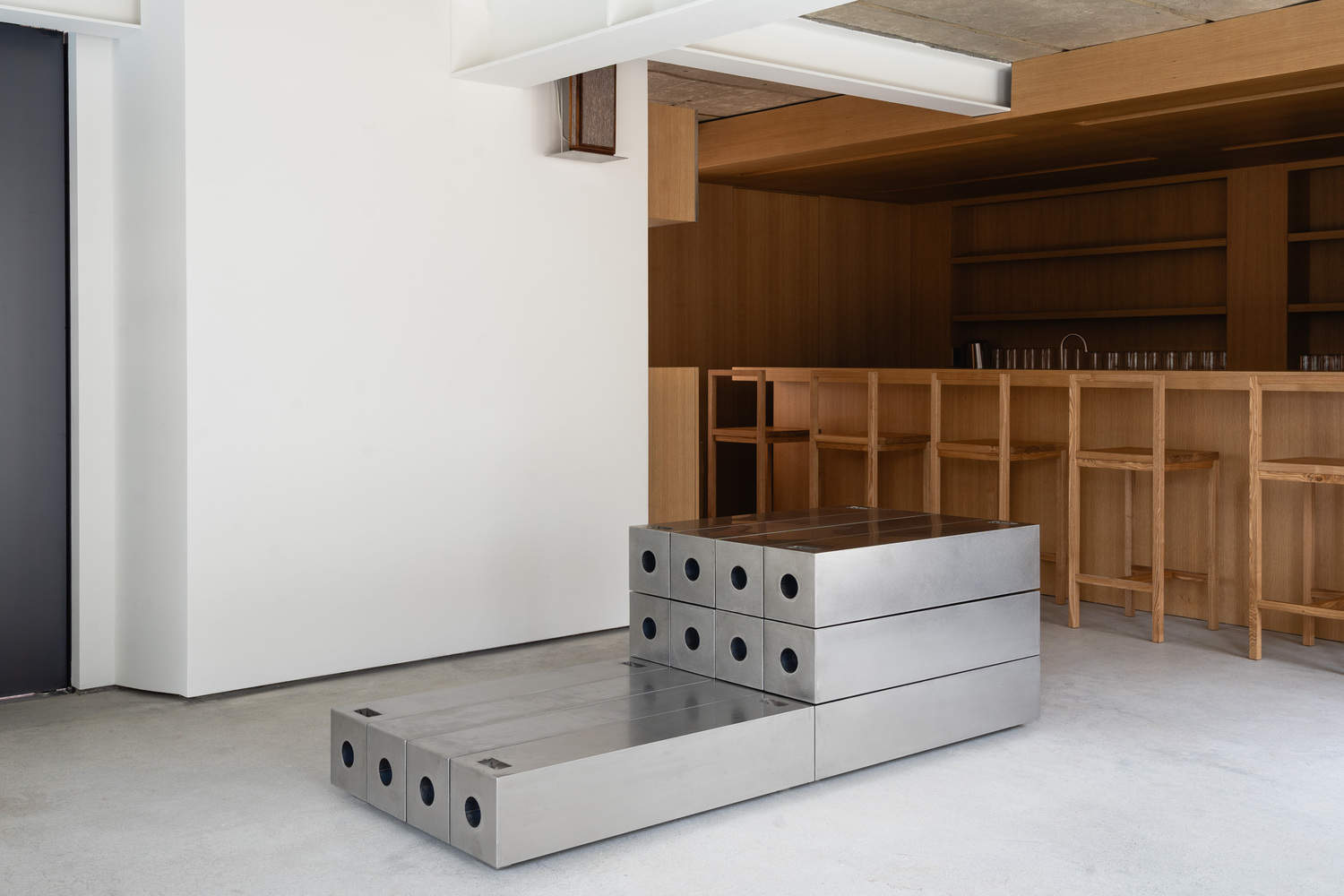 The space was originally used as a house constructed with load-bearing walls, but its function changed with the introduction of a steel structure. By retaining the original ceiling and floor, the space naturally reveals its past and traces of time. The white-painted steel structure and the newly designed walls contrast with the existing ceiling and floor, allowing visitors to sense how the space has transformed. The whisky bar, made of oak, represents the culmination of this transformation and stands as a symbol of the space.