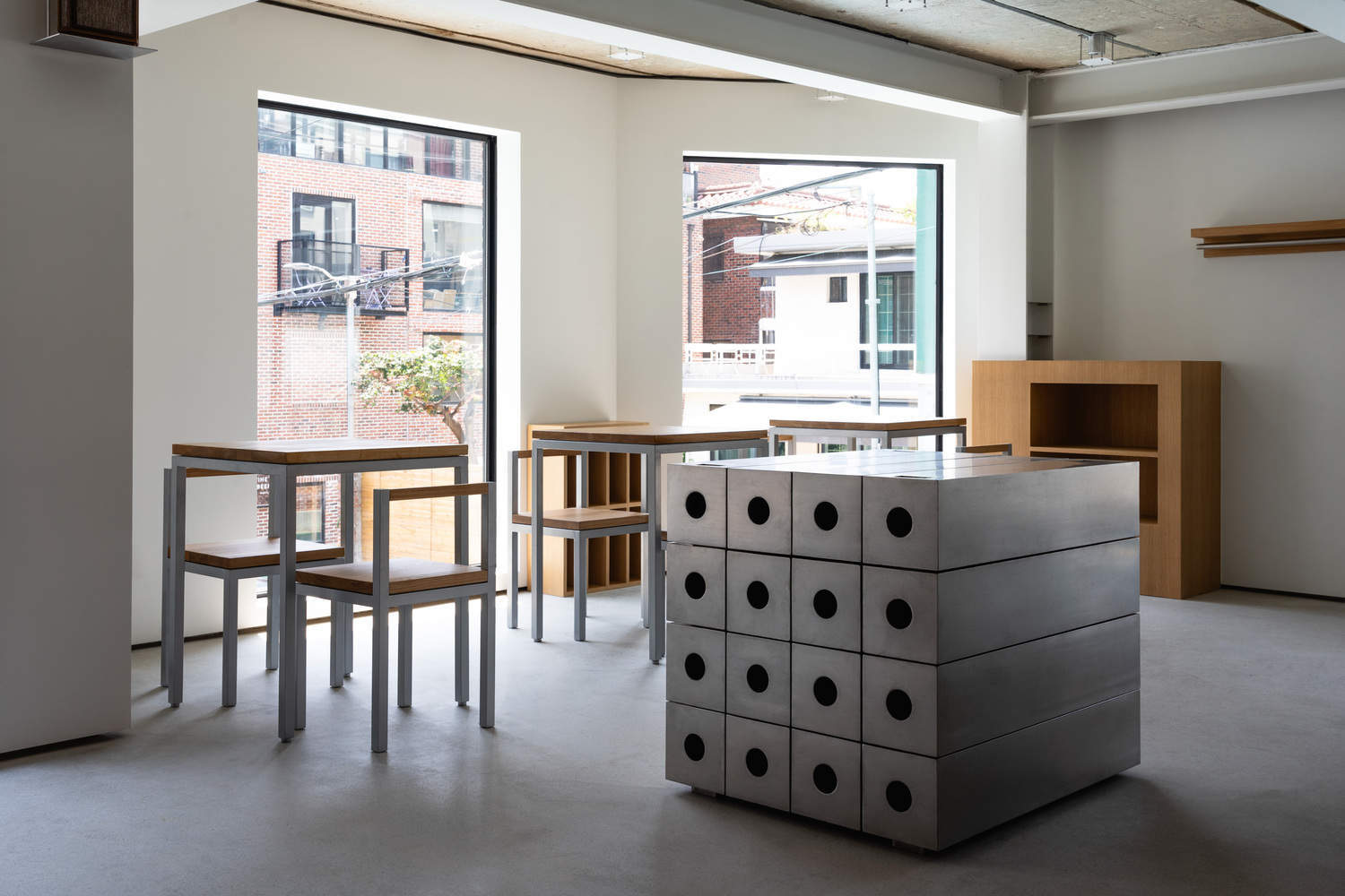 The objects scattered across the space are designed with only the minimal forms necessary for their use. Their free placement, departing from a unified grid, creates various changes in the landscape depending on the direction of view. The metal object located in the center can take on various forms through modular design. These undefined forms can lead to various uses and transformations of the space over time.