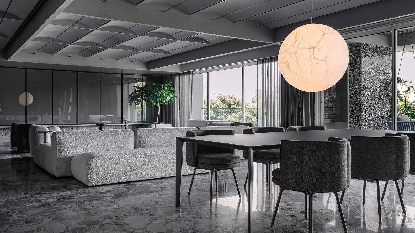 The carpet area of this large apartment is around 4300sft. As you enter the house, its rectangular layout features a large living space on your left. This is the mainstay of the house that connects to the personal rooms by means of a long hallway. Adjoining the living room is the main entrance to the apartment flanked by a bar and kitchen on the rear side of the same. One of the extensions to the living room is the main entrance to the apartment along with a bar. These two secondary spaces are carefully designed in a way that they complement the central space. The entrance of the house is part of a large black scoop that extends to the bar and the kitchen. Any amenity/ element that is part of this negative space gets more attention than usual & feels like a floating mass. Opposite the main entrance an entrance console is flanked by a vertical mass of frosted solid bricks. These solid bricks were an interesting choice of material because the glass and its frosted nature refracts the light in an intriguing manner and create this soft glow around it. This partition divides this black scoop into the entrance side and the bar side. A geometric wall installation sits by the side of this console. The living room is a large cuboidal space. The extensions to this cuboid turn into a bar, entrance, and a large balcony. To control the scale of this cuboid the ceiling has been subdivided into quadrants and the vaulted ceiling cuts through these quadrants on the length side. Vaults are mainly an architectural element used in the construction of buildings throughout history. By utilizing these throughout the apartment, renders the intent more authentic and realistic. Projector screenings happen at one end of this space while a service unit for the dining sits on the other end of this cuboid. The wall cabinets have sandwiched metal mesh used for the sliding glass shutters.