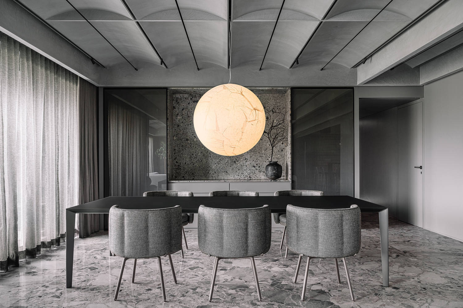 The extended portion of living room seating faces towards the dining in an attempt to establish a dialogue between the two, with the intention of making dining a less isolated activity. This setup has more protentional to become a social space with guests spilling over towards dining, in accordance with the client's requirements. Also, the Moon, a lighting pendant designed by Davide Groppi, being central to the space holds the entire space together. In fact the very sight of the Moon from the main entrance sets up the visitor with that bit of curiosity about the space. The seating square of the living room has Ceppo De Gre marble across the floor. The dining & the rest of the area have light Gre Ceppo on the floors too. Ceppo De Gre is used widely in the facades of buildings in Europe but in contrast rarely used in India. The personality of the stone is rugged and of architectural nature. By specifying it for the floors and wall we wanted to give the house a bit of a masculine feel and also incorporate the uniqueness factor. The material palate of living and the rest of the apartment has been rendered in Greyscale. To create interest in this scheme we encouraged the clients to use a lot of plant greens in the space. This infuses life into spaces. The long hallway connects to the guest room first in the sequence. It's a simple clean space with a headboard done in Cubo granite from RK marble. The vaults here are of narrower widths. One of the walls has a cutout cladded in the same Cubo stone housing the temple space. This cutout is covered by double-leaf sliding shutters to cover the temple.
