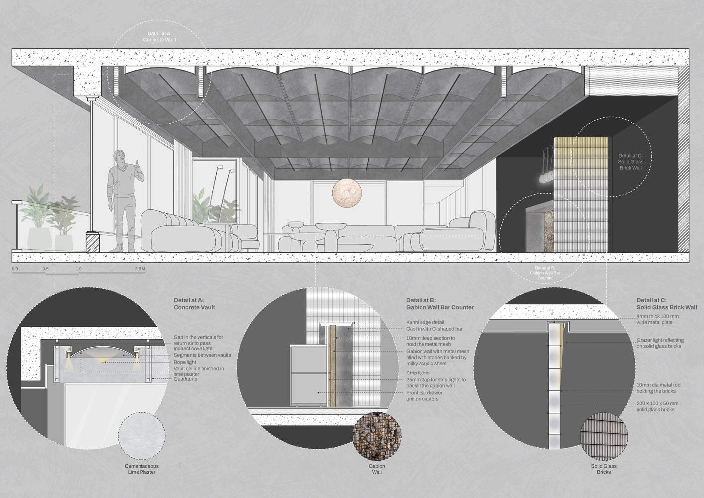 Vision: As it stood, we had worked extensively with the couple previously due to which there was that comfort and mutual understanding from the get-go. Throughout the designing process, there was a certain trust that the clients had put in us as they had seen our work over the years and were familiar with the peculiar way we look at things related to interior design. Wanting to create that unique aesthetic experience we looked towards architecture for inspiration. After a few initial discussions, the idea of architectural vaults fascinated us. Thus we decided to use it as a primary element as a part of the ceiling and be consistent with its exploitation throughout the space lending it more authenticity. Along with that elements like gabion wall, solid glass bricks, and Ceppo De Gre stone shared this very architectural intent. On the other hand, we wanted to be pretty miserly and minimalistic with our material palate. This gave rise to a monochromatic space. So as a result we wished for, and worked towards a space that was niche, minimalistic, and social.