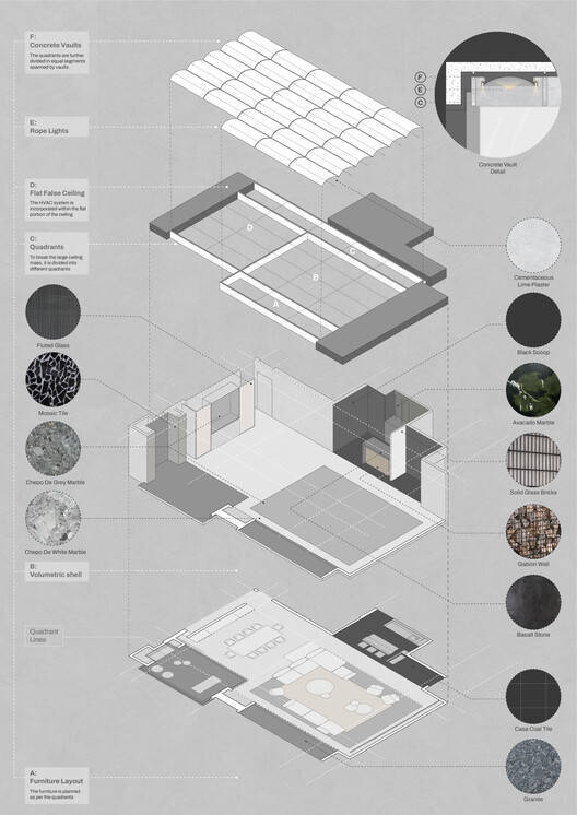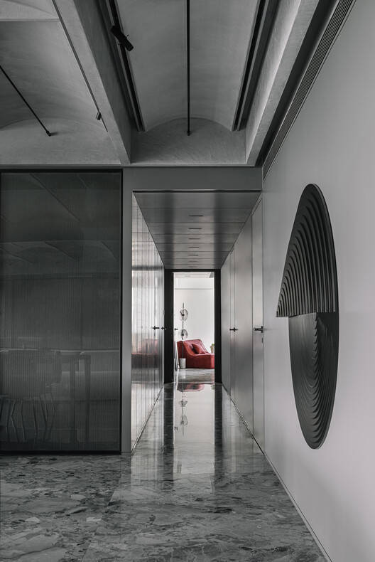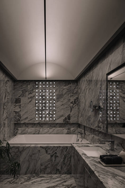 愿景:就目前而言,我们之前与这对夫妇进行了广泛的合作,因此从一开始就有了舒适和相互理解。在整个设计过程中,客户对我们有一定的信任,因为他们多年来看到了我们的工作,并熟悉我们看待室内设计相关事物的独特方式。为了创造这种独特的审美体验,我们从建筑中寻找灵感。经过几次初步讨论,建筑拱顶的想法让我们着迷。因此,我们决定将其作为天花板的主要元素,并与整个空间的开发保持一致,使其更加真实。除此之外,石笼墙、实心玻璃砖和Ceppo De Gre石等元素也具有这种建筑意图。另一方面,我们希望在材料品味上非常吝啬和简约。这就产生了单色空间。因此,我们希望并努力打造一个小众、简约和社交的空间。