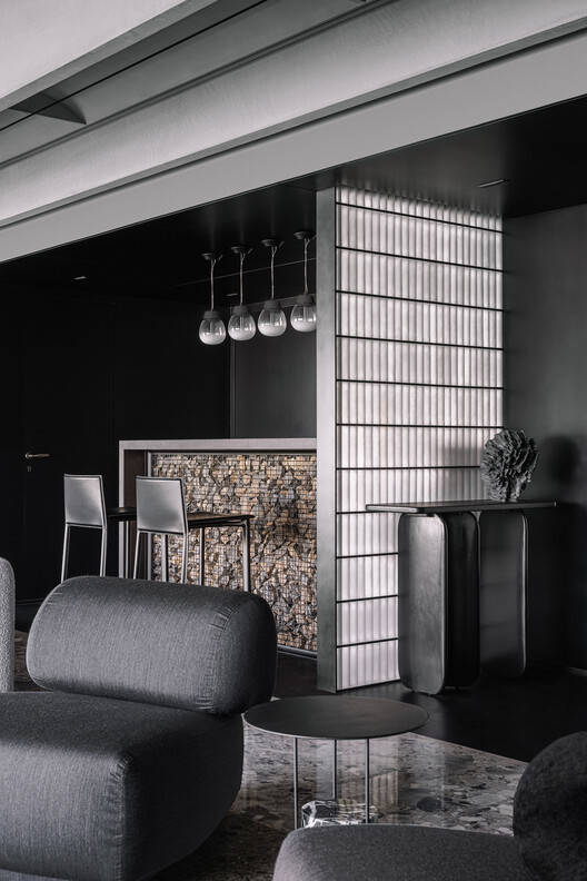 主要特征-为了延续建筑主题,酒吧被想象成这个巨大的黑色勺子的一部分,从房子的主入口开始,一直延伸到厨房的入口。这条独家新闻的材料是黑色陶瓷地板、黑色PU涂层墙壁和天花板。酒吧本身被概念化为加宾墙的一部分,因为它的外墙。这是通过在金属丝网中捕获随机大小的石头而实现的。除此之外,这种布置可以通过安装在丙烯酸隔板上的一系列LED灯进行背光照明,该隔板支撑着这片非常垂直的石头。在主入口对面的这家酒吧的两侧,有一块磨砂玻璃砖隔断。这个隔断在酒吧和主入口之间创造了这种相互作用。这种玻璃的折射质量照亮了这个原本强烈的空间。