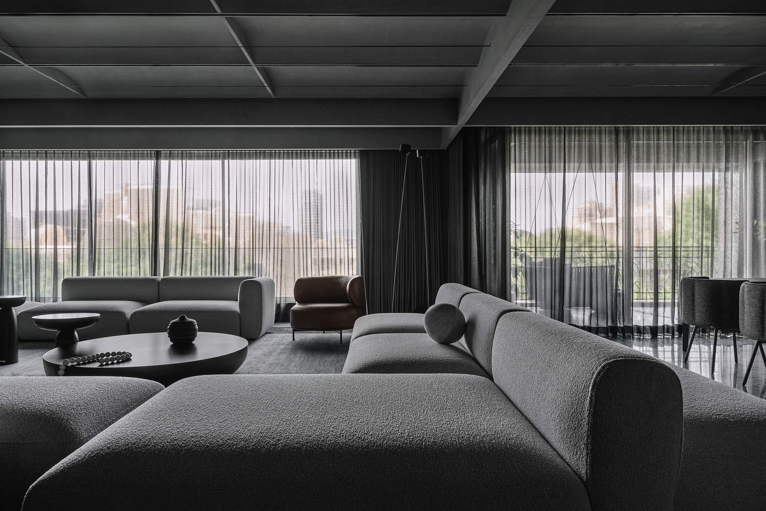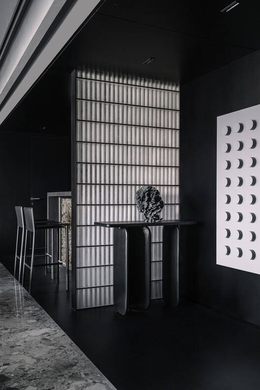 这间大公寓的地毯面积约为4300平方英尺。当你进入房子时,它的矩形布局在你的左边有一个很大的生活空间。这是房子的支柱,通过一条长长的走廊与私人房间相连。客厅旁边是公寓的主入口,两侧是酒吧和厨房。客厅的扩建部分之一是公寓的主入口和酒吧。这两个次要空间经过精心设计,与中央空间相辅相成。房子的入口是一个延伸到酒吧和厨房的黑色大铲子的一部分。任何属于这个负面空间的便利设施/元素都会比平时受到更多的关注;感觉就像一个漂浮的物体。在主入口对面,入口控制台两侧是一块垂直的磨砂实心砖。这些实心砖是一种有趣的材料选择,因为玻璃及其磨砂性质以有趣的方式折射光线,并在周围产生柔和的光芒。这个隔板将这个黑色的勺子分为入口侧和酒吧侧。这个控制台旁边有一个几何墙装置。客厅是一个巨大的长方体空间。这个长方体的延伸部分变成了一个酒吧、入口和一个大阳台。为了控制这个长方体的比例,天花板被细分为四个象限,拱形天花板在长度侧穿过这些象限。拱顶主要是历史上建筑中使用的建筑元素。通过在整个公寓中使用这些元素,使意图更加真实和现实。投影仪放映发生在这个空间的一端,而餐饮服务单元位于这个长方体的另一端。壁柜中间夹着用于滑动玻璃百叶窗的金属网。