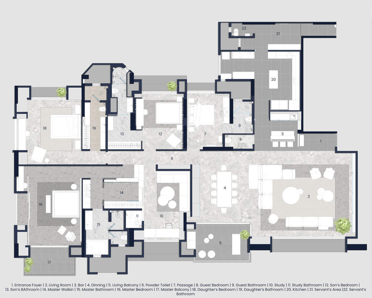 Apartment size + Way the structure was handled - This apartment is nestled in the central suburb of Mumbai, with a carpet area of 4300sft. Our scope was to design the apartment from the bare shell status to its completion. The bigger chunk of existing planning was maintained however changes were made to open up certain spaces of importance. The master walk-in wardrobe was increased in size along with bathroom space. This increase in area was accommodated in the adjoining bedroom which was converted into a study. In the living room space, an alcove was created to accommodate a decently sized fully serviced bar along with the main entrance lobby. This resultant increase in space spilled over into the kitchen prompting a complete replanning of it along with the servant quarters. Throughout the apartment, smaller shifts of walls and partitions were planned to increase the efficiency of the given space.