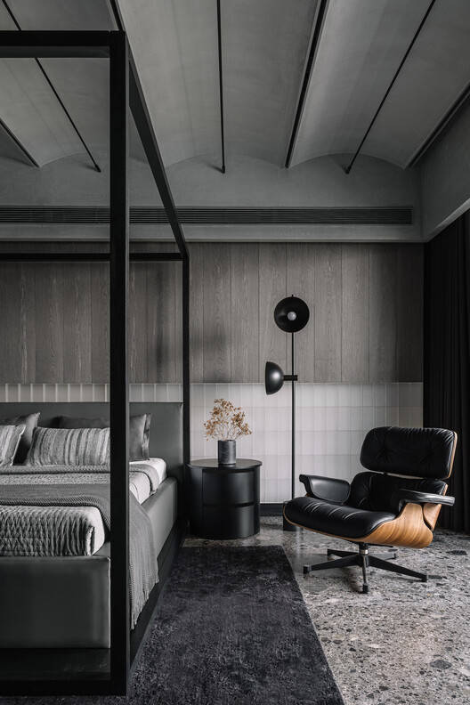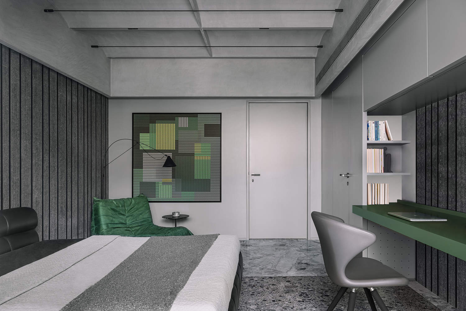 接下来,在走廊上,你会遇到书房和儿子的房间。这项研究有一个温暖的口感,引入了橡木贴面,因为客户想要一个舒适明亮的空间。书桌放在窗户的两侧,两边都有足够的空间存放书籍、迷你冰箱和打印机等。这项研究本身就是一块从头到尾横跨的长木板,没有任何间断的支撑。入口附近有一张L形沙发,供客人娱乐。书房入口对面是孙的卧室。这个房间有一个舒适的空间,还有一个书房和一把躺椅。房间的气氛舒适,主要是单色材料的口味。以学习桌和扶手椅挂毯的形式引入绿色打破了这种灰度。床头板墙由粗糙的成品花岗岩制成的不等垂直板条制成。每个房间的天花板都是一个大槽的形式,里面有拱顶。此操作将天花板从墙上拆下。接下来是走廊尽头的主人和女儿的卧室。主卧室从通道开始,通道首先通向步入式衣柜+卫生间的入口,然后通向卧室本身。卧室里有一张巨大的四柱床,旁边还有Eames躺椅。床头板墙由底部的磨砂玻璃砖和顶部的灰色贴面条组合而成。玻璃砖可以背光,为空间提供环境光。天花板上的拱顶由天花板两端之间的一根长而张紧的绳索灯照亮。如前所述,一系列三个滑动门为房间的使用创造了一个有趣的场景组合。女儿的卧室有点与众不同,与房子里通常使用的材料口味不同。房间的气氛是明亮的,主要使用白色作为外壳。中间有一张宽大的软垫床,床头板墙覆盖着粗糙的成品花岗岩。研究台悬挂在两条垂直线之间,中间没有间歇支撑。外围的管道空间被大型滑动门隐藏,用于存放各种物品,使其看起来像是移动的墙壁。