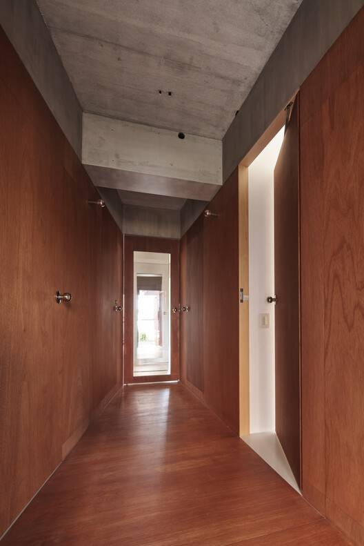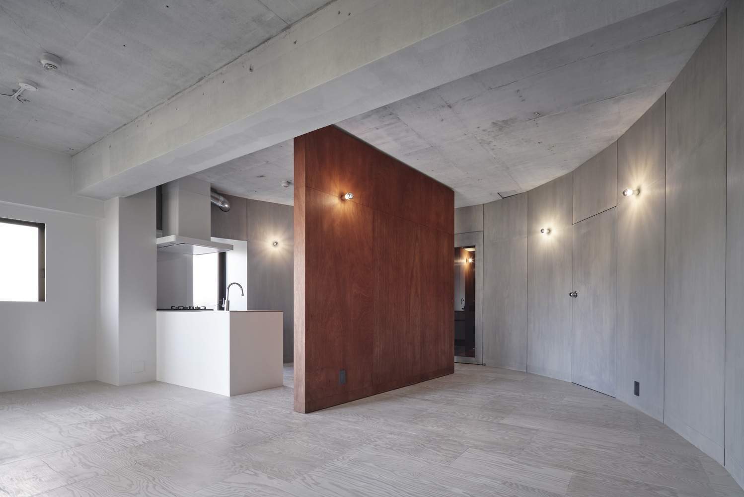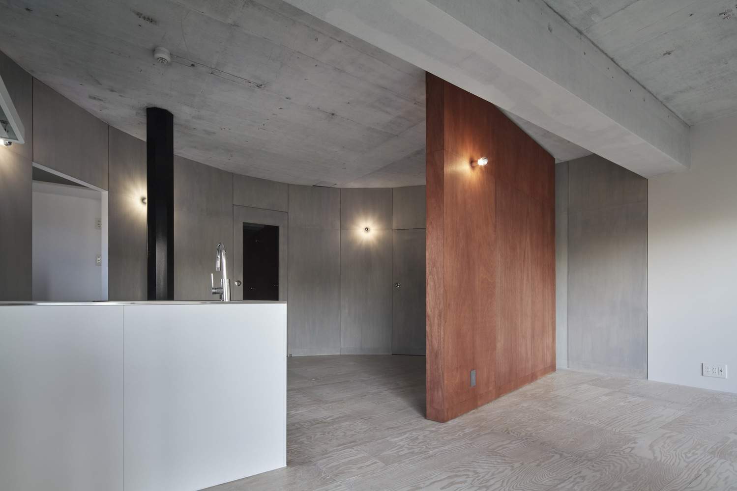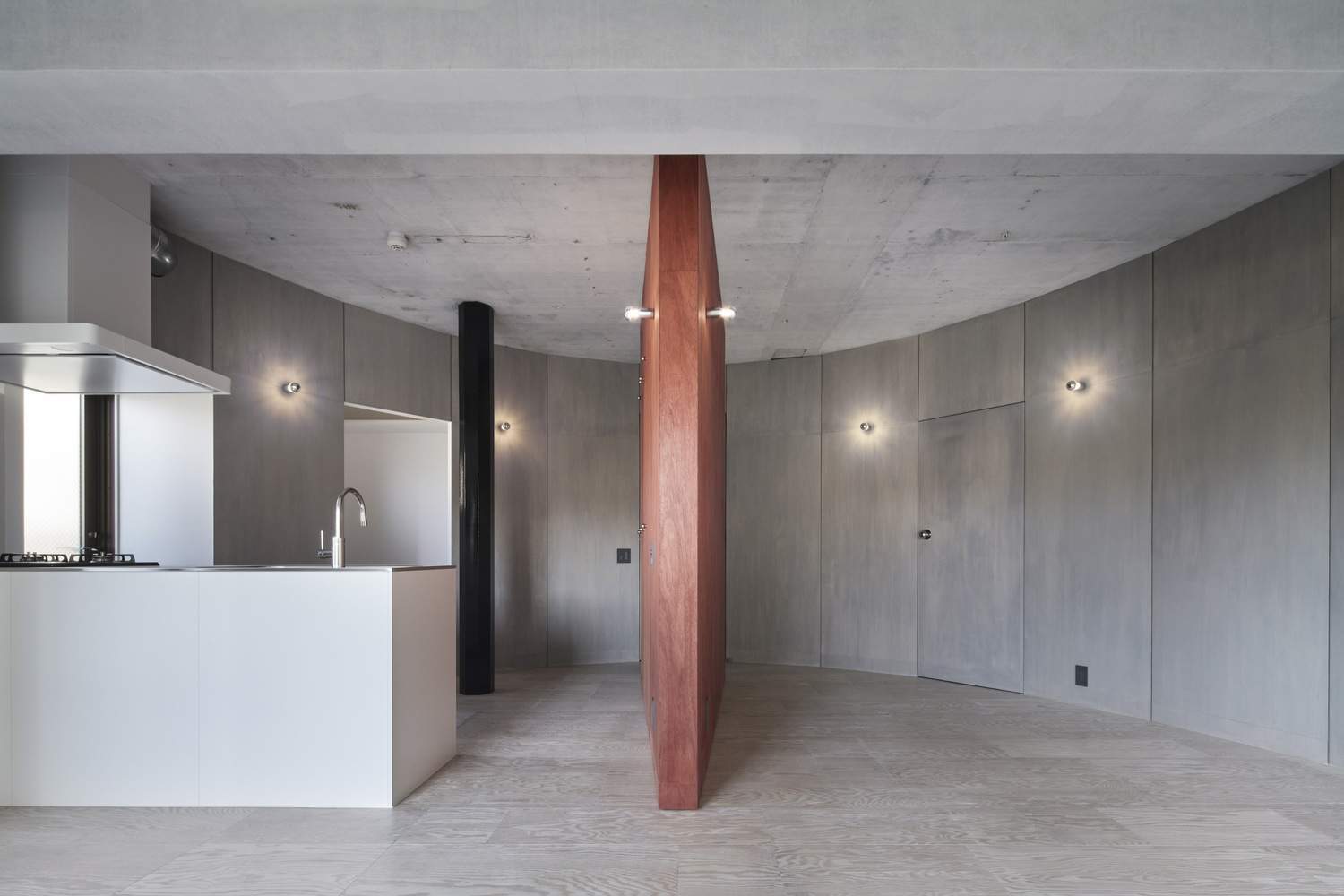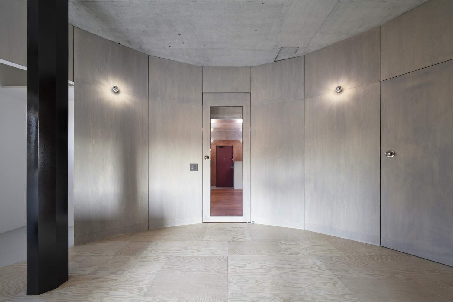 This flat has a corridor, individual bedrooms and one LDK. What differentiates the generic layout is the interaction between the elliptical expanded space or the wedge-shaped corridor and the generic space. The entrance door opens into a space that is separated from the common areas of the building. The floor and walls are finished in red plywood, and doors on either side of the corridor open to reveal bright white private rooms; when entering the LDK, a mirror placed in the front reveals the entrance behind, while the elliptical wall guides the eye outwards. Paradoxically, the expanded interpretation of market principles = adherence to the nLDK format has created a new kind of nLDK.