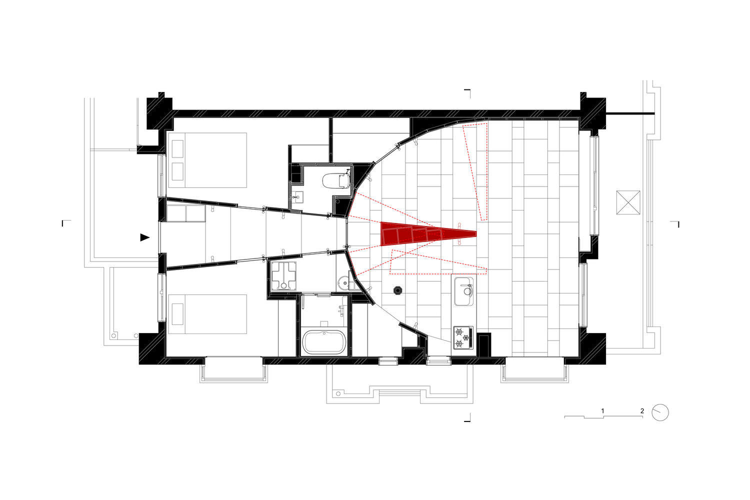 这套公寓有走廊、独立卧室和一间LDK。通用布局的区别在于椭圆形扩展空间或楔形走廊与通用空间之间的相互作用。入口门通向一个与建筑公共区域隔开的空间。地板和墙壁用红色胶合板装饰,走廊两侧的门打开,露出明亮的白色私人房间;当进入LDK时,放置在前面的镜子会显示后面的入口,而椭圆形的墙壁会将眼睛向外引导。矛盾的是,对市场原则的扩展解释=坚持nLDK格式创造了一种新的nLDK。