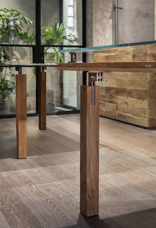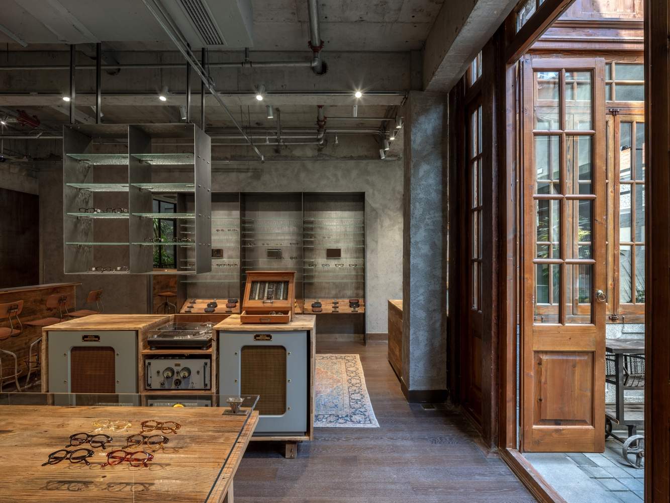 Beside the details structurewe reformed from eyeglass hinges, the use of wood material of the displayfixtures fit the brand's craft attributes. The old elm panel were salvaged from old wooden architecture. Instead of gluing the panels together, hundreds of small panels are built into tables and cabinets in the space by using a traditional mortiseand tenon fingerjoint technique. We appreciate the wood factory we cooperate with, which is still willing to complete the manual production at the moment of stressing efficientproduction.