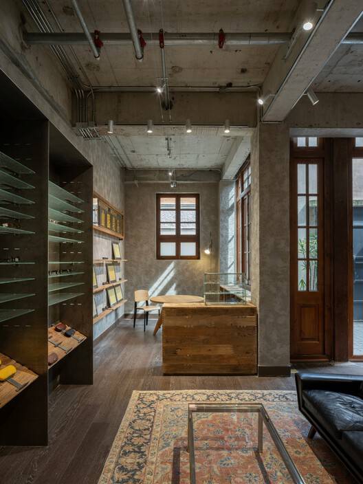 设计理念与品牌传承:这个项目在上海张园为 Hakusan Megane 打造的店铺,充分体现了品牌的历史传承与创新。设计团队遵循东京涩谷店的展示逻辑,将眼镜腿结构转化为功能性接缝,结合传统木榫技术,在经典中展现创新。同时,精心挑选经过时间保存或回收的材料,与场地和品牌历史对话,让空间充满历史韵味。