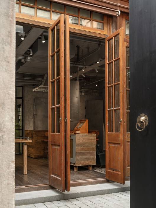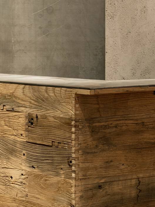 项目地点——张园,19世纪末上海最著名的花园。如今,经过近年来的保护性修复,它被赋予了新的商业和文化价值。受到这个地点的启发,每个设计团队都精心挑选了经过时间保存或回收的材料,而不是新鲜闪亮的质地。试图让空间与网站和品牌的历史进行对话。排铁板和老榆树的结合完成了上述叙述。通过使用我们精心选择的材料,金属的冷硬和木材的温软之间没有冲突。在时间的作用下,材料表面的氧化痕迹将它们整合在一起。
