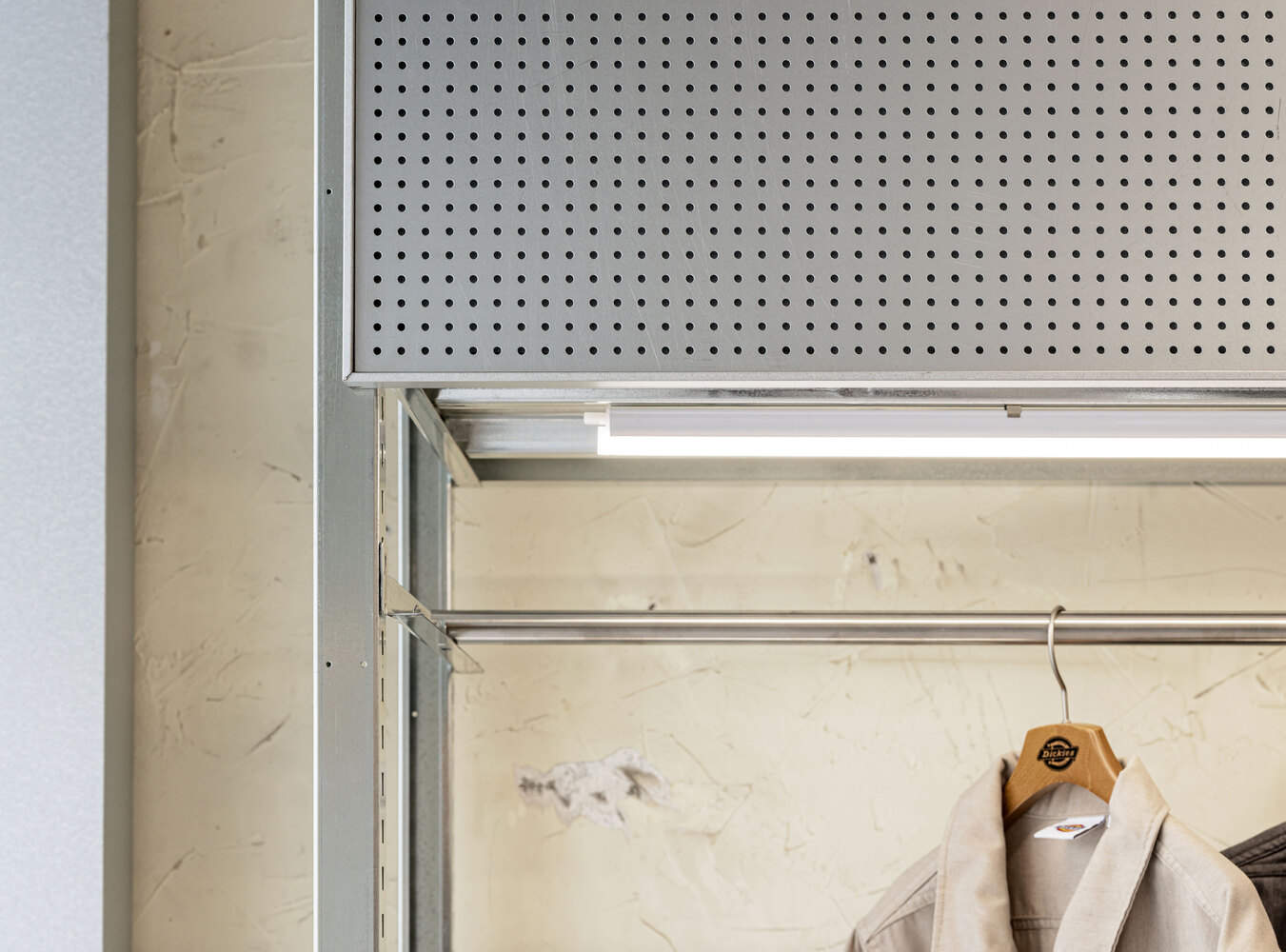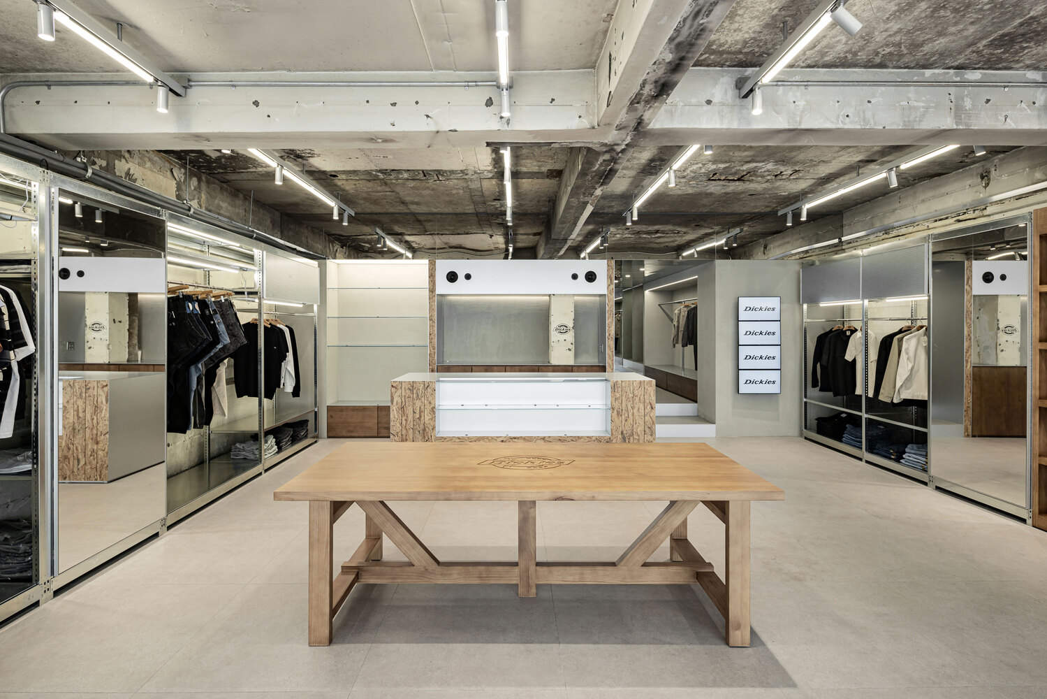 Inside, the store showcases a wide range of apparel and goods, structured with a clear zoning strategy to enhance both customer experience and sales. Steel and wood were strategically used to emphasize the brand’s different product categories, while the collaboration zone was designed to stand out, providing a modern platform for Dickies’ partnerships with other brands. This layout not only boosts product visibility but also contributes to the store’s overall functionality, helping to guide visitors smoothly through different sections. The interior walls and ceilings were left untouched to preserve the traces of time, a deliberate choice to connect Dickies' brand philosophy of longevity and resilience with the building's history.