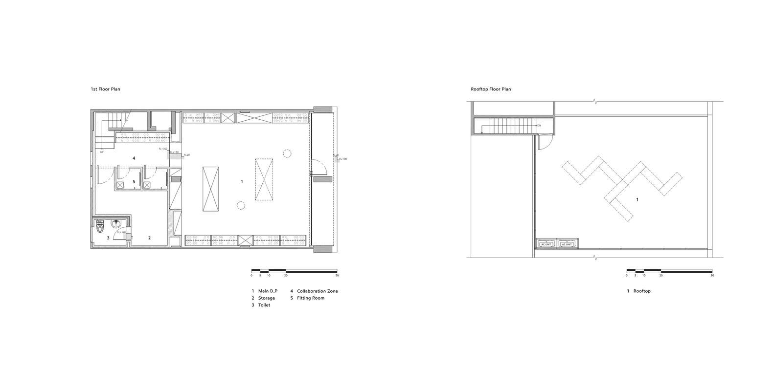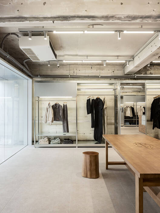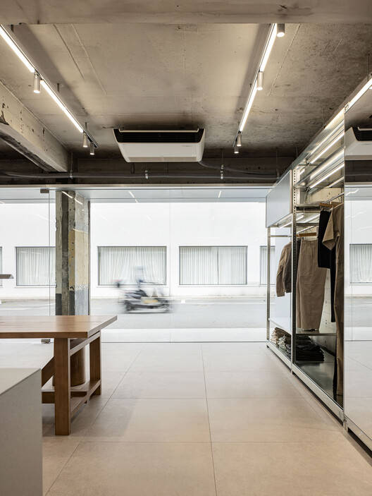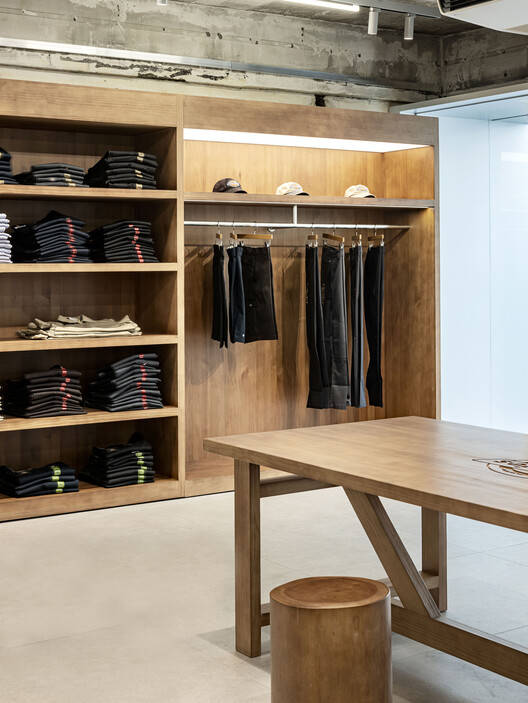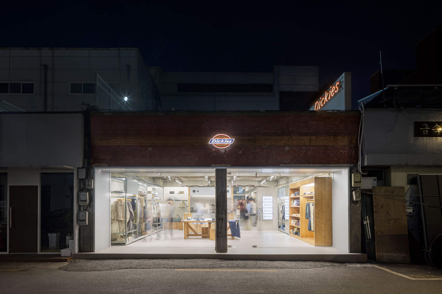 建筑师提供的文字描述Text description provided by the architects. Dickies, an iconic American workwear brand, has opened its first flagship store in Korea, located in Seongsu, Seoul. This project was launched by Musinsa, aiming to shift Dickies' image in Korea while preserving its core values. The site was formerly a leather goods store housed in a 40-year-old building. The aged exterior, with its weathered red bricks, was retained to reflect the historical context of Seongsu, an area known for its industrial past.