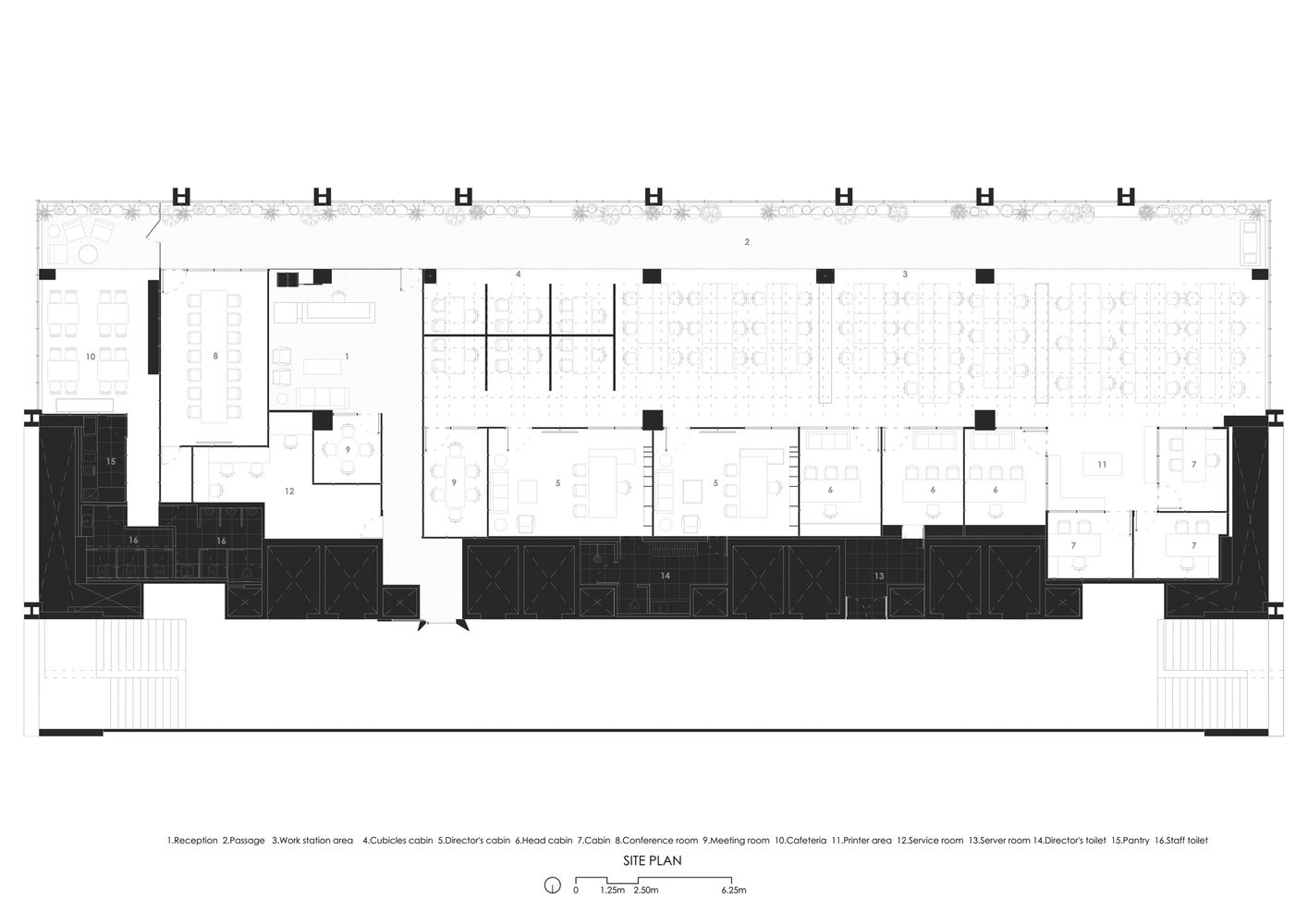 这一特征决定了室内空间的大部分规划。南部的开口为整个空间带来了充足的光线,但在艾哈迈达巴德的大部分时间里,它也带来了35-45摄氏度的高温。该办公室的结构要求有8个封闭式工作空间、6个部分封闭的隔间和60个开放式工作站。