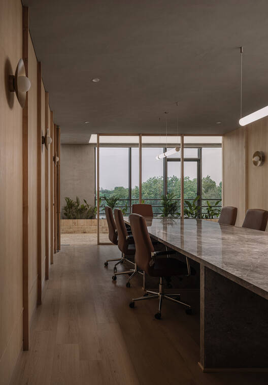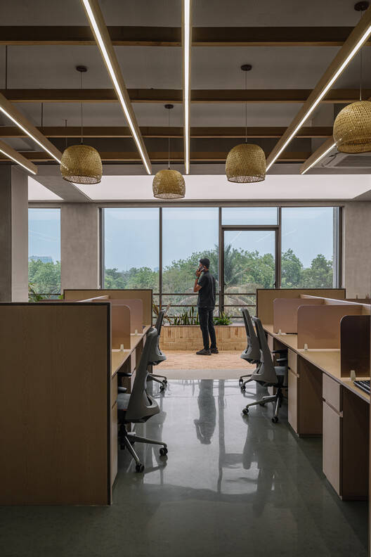Text description provided by the architects. ES Office is the result of a design idea based on the intention to let the outdoors pour in while also proving to be a climate-friendly design solution. This 7500 sq ft office is spread across an entire office floor of a commercial building on a prominent Ahmedabad street. The space gets all its natural light through a wide panoramic glass facade wrapped on the east, west, and south facades of the building. The south opening is the widest one with a 140 feet glass facade running along the entire length of the space.