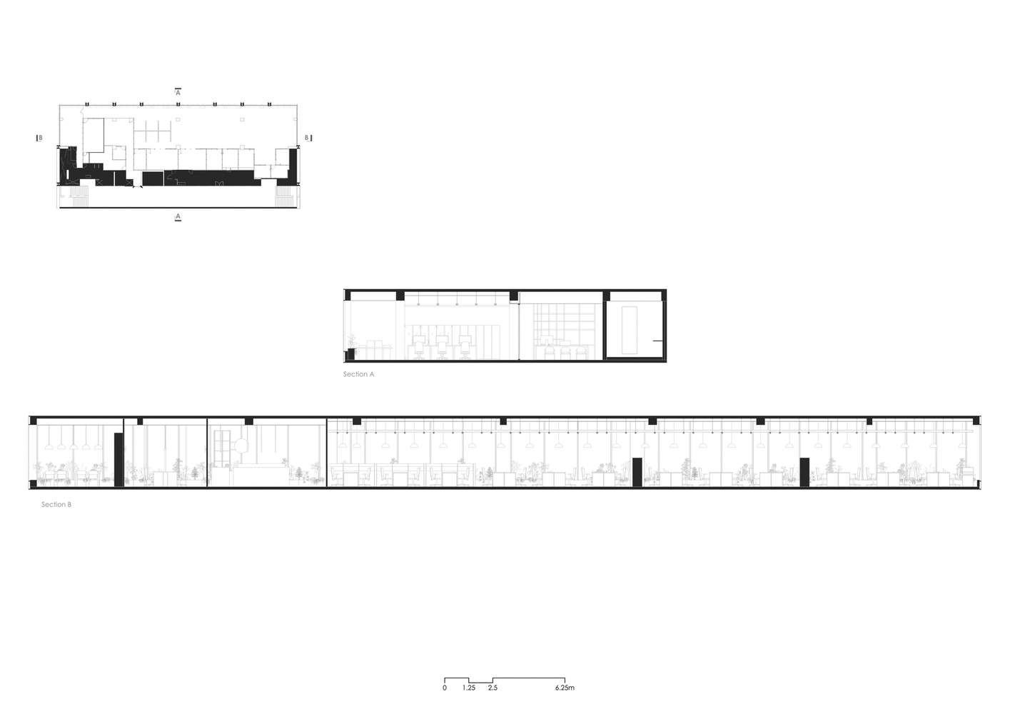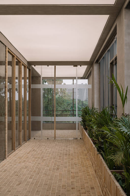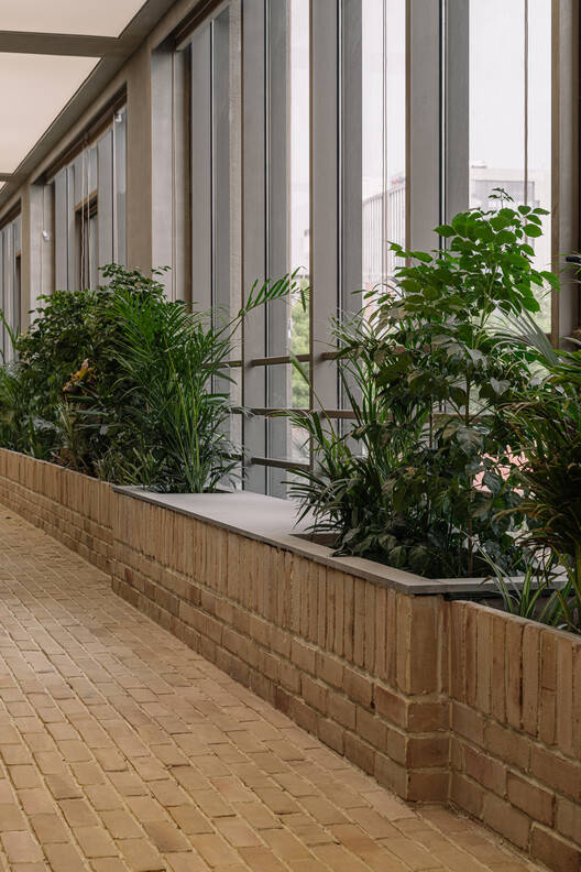从南面看,是一片开阔的绿地。这条通道被视为这个绿地的延伸,砖块和花盆融入了设计中。此外,照明设计旨在复制天窗,进一步增加外部涌入的效果。工作地板以“半开放”空间的方式处理,主要照明元素灵感来自格子阳台的檩条,只有小屋真正被视为“内部”空间。