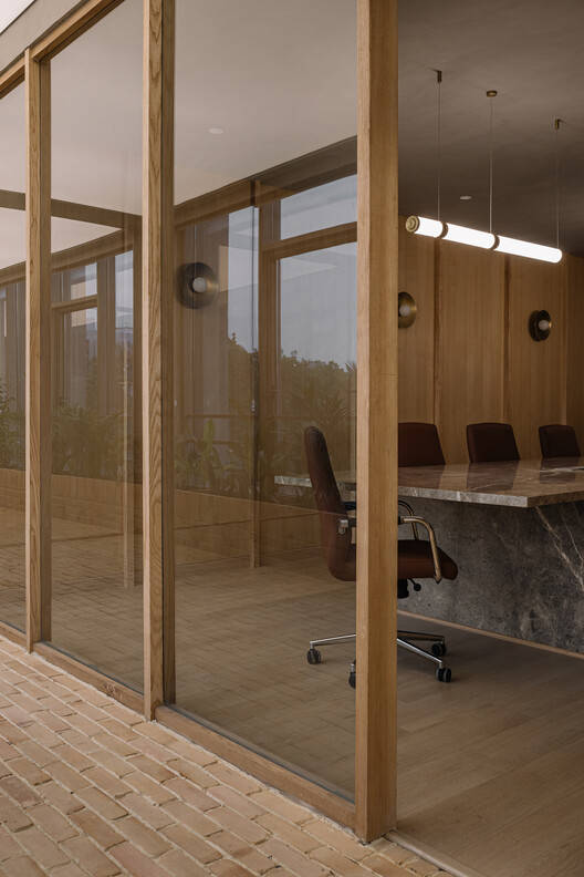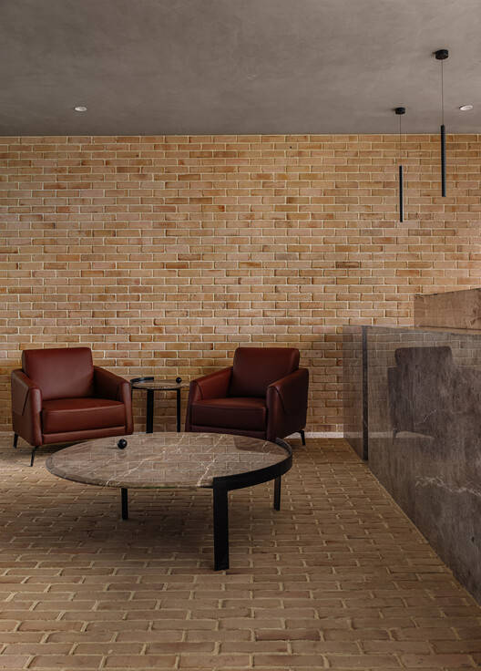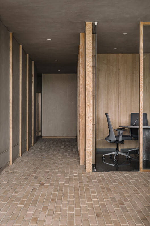接待室和会议室是绿色走廊的延伸,游客最初通过一个相对独立的入口进入,随着向接待区移动,空间逐渐展开。绿色的景色为宽敞的砖砌接待空间提供了背景。接待区两侧是一个小型会议室和一个大型会议室,方便访客进入,而不会干扰主要工作区。