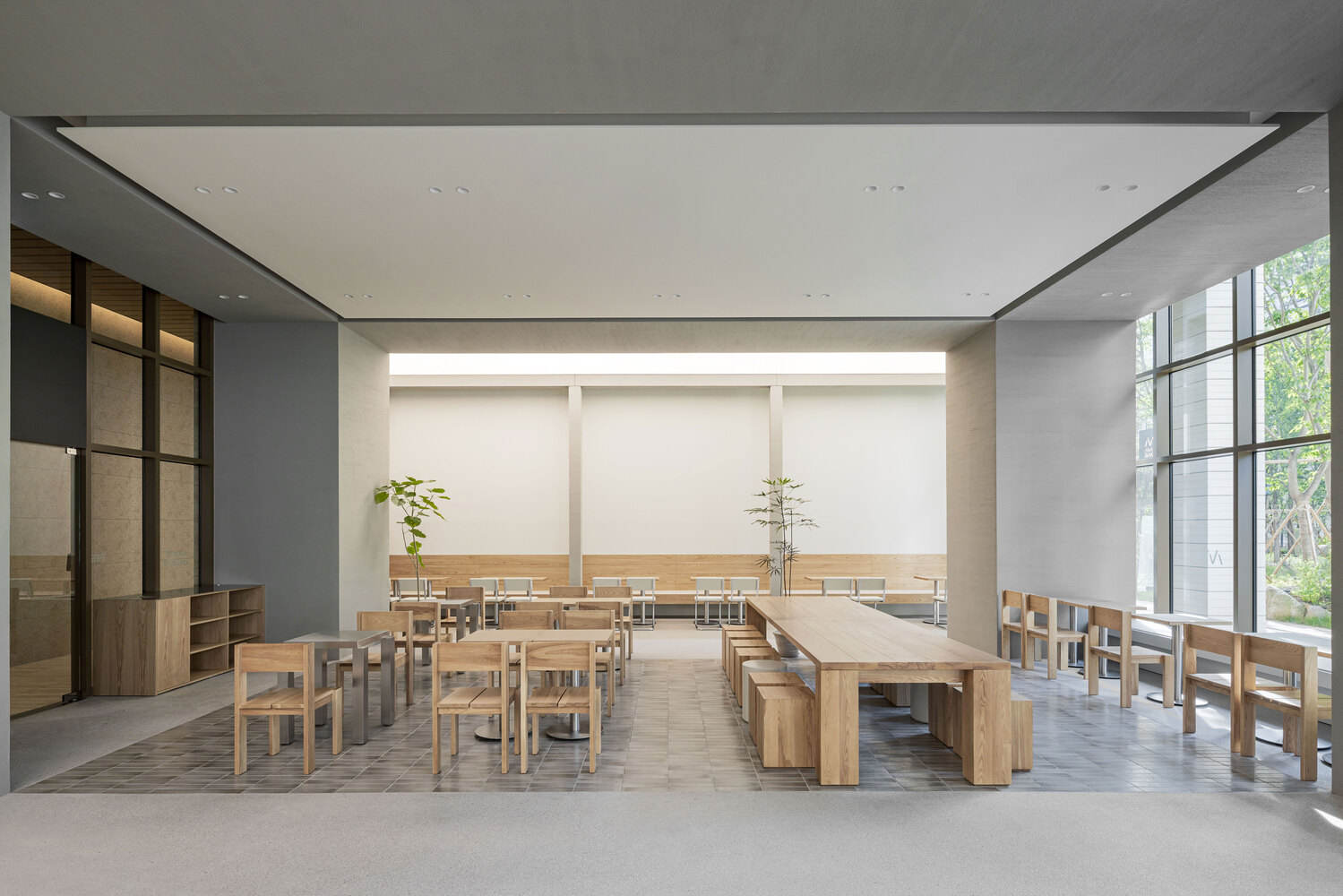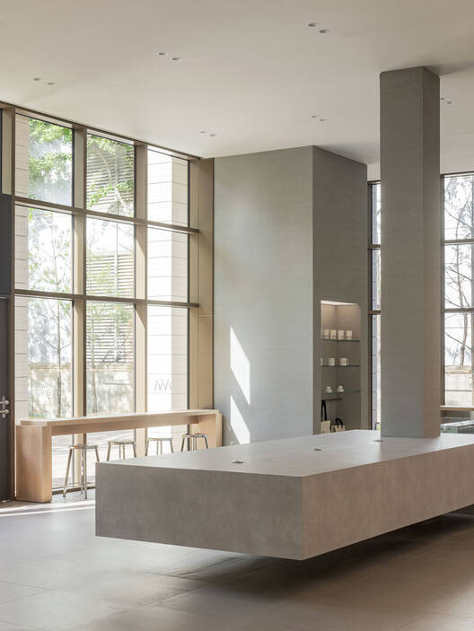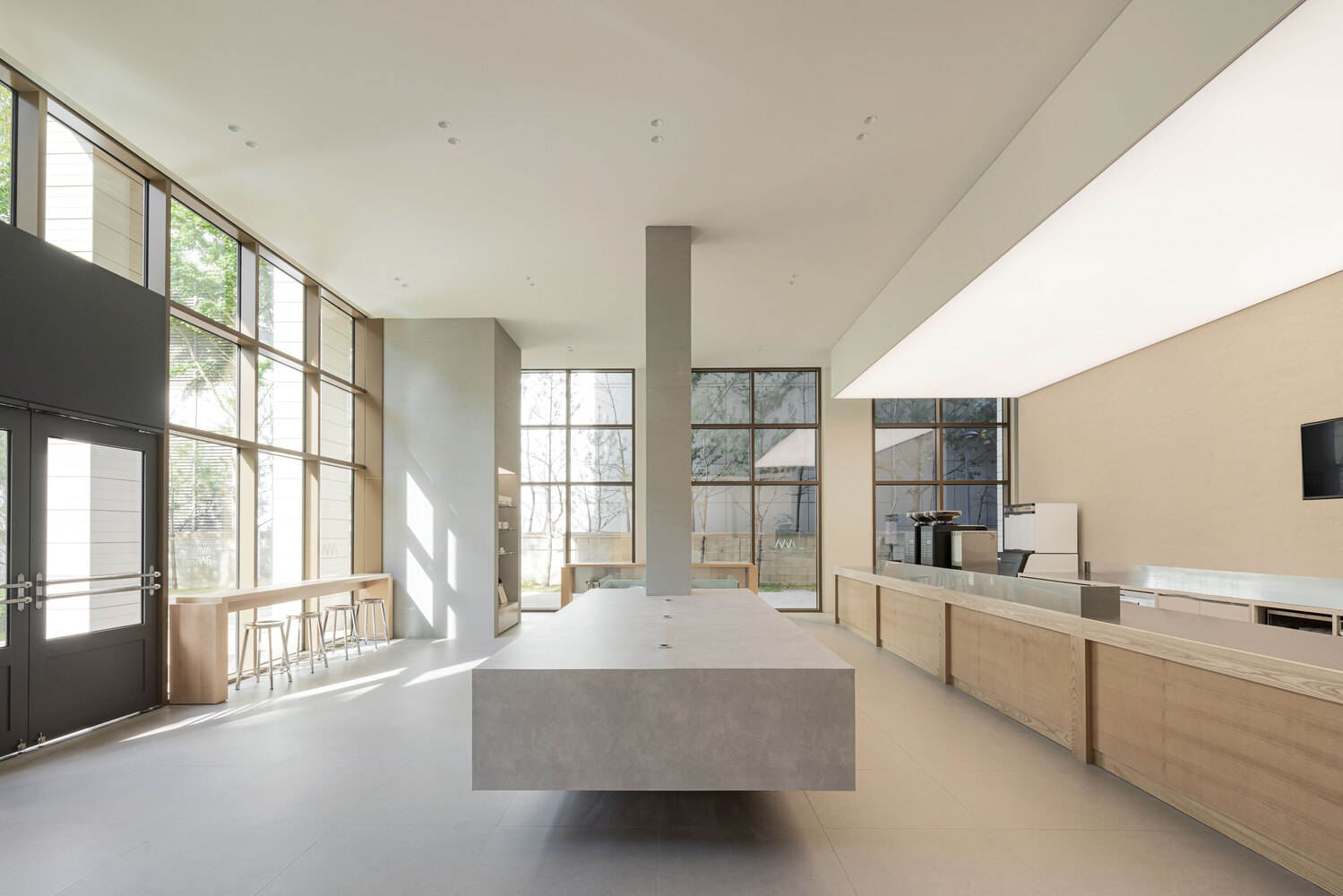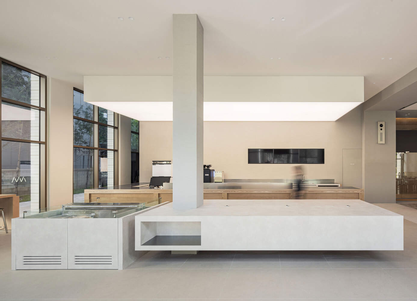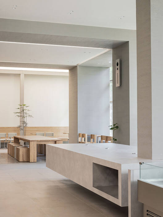独特设计与品牌融合:Avant Bakery Gasan 分店位于繁华办公区,其设计独具匠心。从入口处高耸的柱子和漂浮的面包展示柜,到柜台后的服务区,空间设计既展现出宏伟感又不失亲密氛围。户外景观的引入增添了自然元素,与内部天然材料相呼应,确保空间在品牌中具有独特身份。中性色调营造平静环境,突出面包和甜点这一品牌精髓。