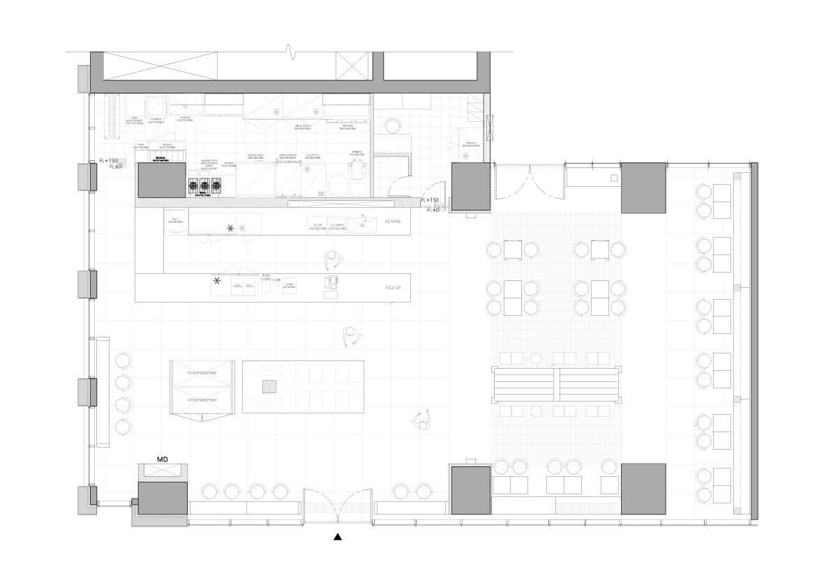 The seating arrangements are varied and thoughtfully designed to offer flexibility based on the customer’s needs or mood. Whether visitors come alone for a moment of reflection, with colleagues for a brief meeting, or in groups for a more social experience, the variety of seating ensures that the space can accommodate. Some seats offer views of the landscaped exterior, providing a tranquil backdrop for guests to enjoy as they savor their food. The space is designed to accommodate both the functional needs of busy professionals and those looking for a moment of peace amidst the hustle and bustle of the city.