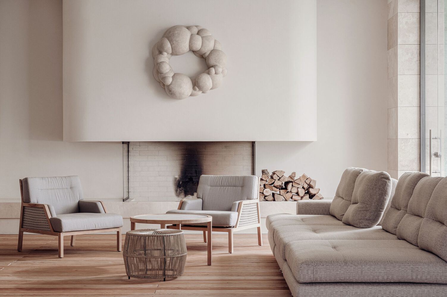 The Mureli House project, probably since the time of another project of the studio — Shkrub House, used the largest number of author's product designs of Serhii Makhno's workshop. In addition, 90% of all furniture and materials here are Ukrainian. “It's Makhno's style” as our customers say, or as we explain — it's contemporary Ukrainian style. The business card of this facility will most likely be its hall. Towering walls, a panel of 600 Tetrapods, and 5 huge Khmara lamps, each floating under the ceiling and shining in its direction. Textured walls and stairs add softness to the space, making it real, natural, and not perfected beyond recognition. Handrails made of bent wood were a difficult task for craftsmen. But Ukrainian hands are capable of anything, that's why the handrails in Mureli House are made precisely according to the wishes of the designers, and the angle of inclination of each wave is preserved.