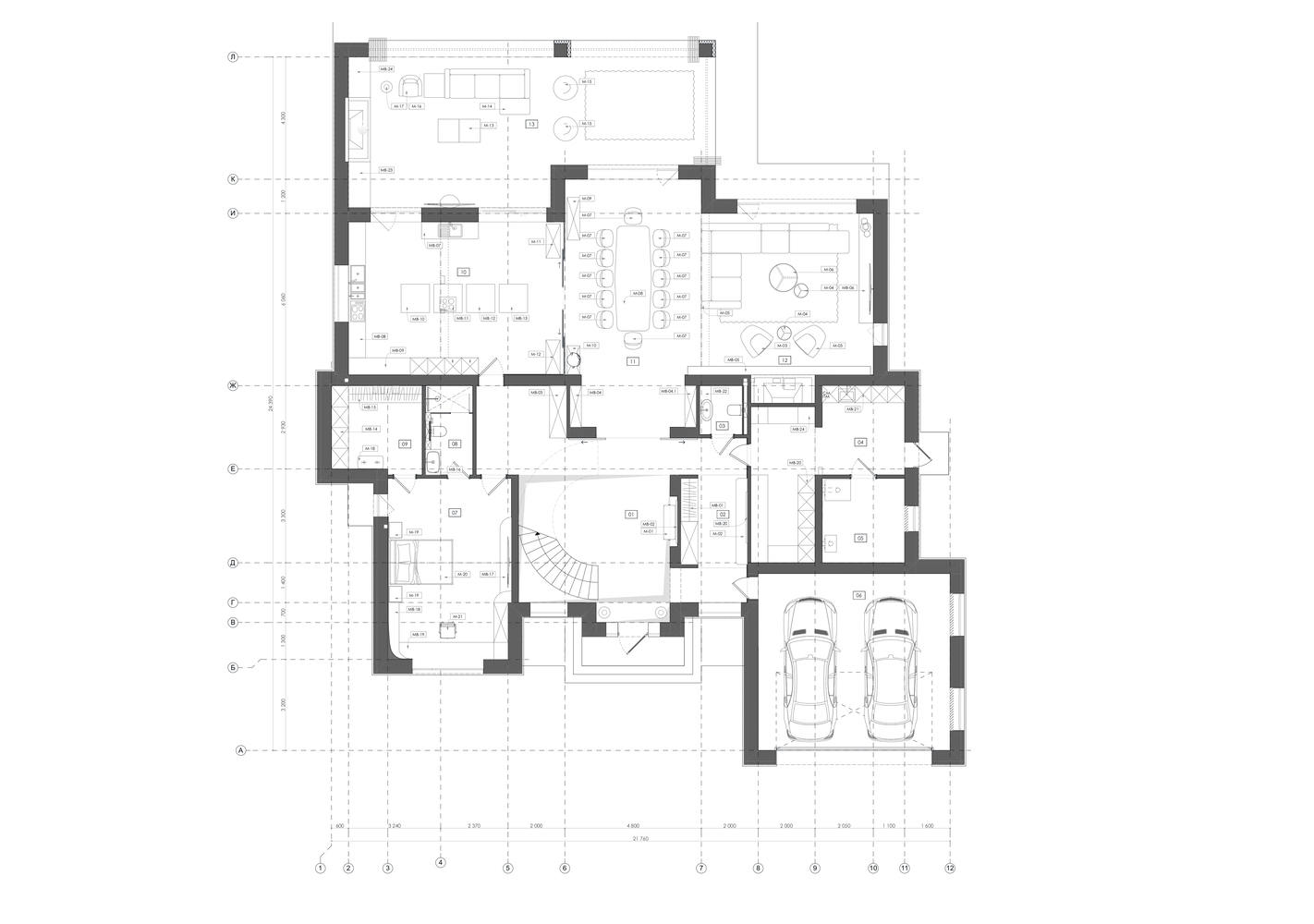 This project has one difference that is valuable for our experience. The walls and ceilings in Mureli House are rounded like the sides of an apricot. This became a challenge for our architects and general contractors. But they created as many junctions as needed for a perfect shape. We also found a way to make shadow seams on the floor and ceiling. For the final result, we needed patterns, according to which the masters cut out the plasterboard and mounted it. And we made it possible to perfectly fit all cabinet furniture into these radius walls. The drawings made during the work on this project are framed on the wall. Behind the sliding doors, the meeting area for guests begins — a wooden dining table for 12 people with soft Elephants, and a Khmara stretched over it all.