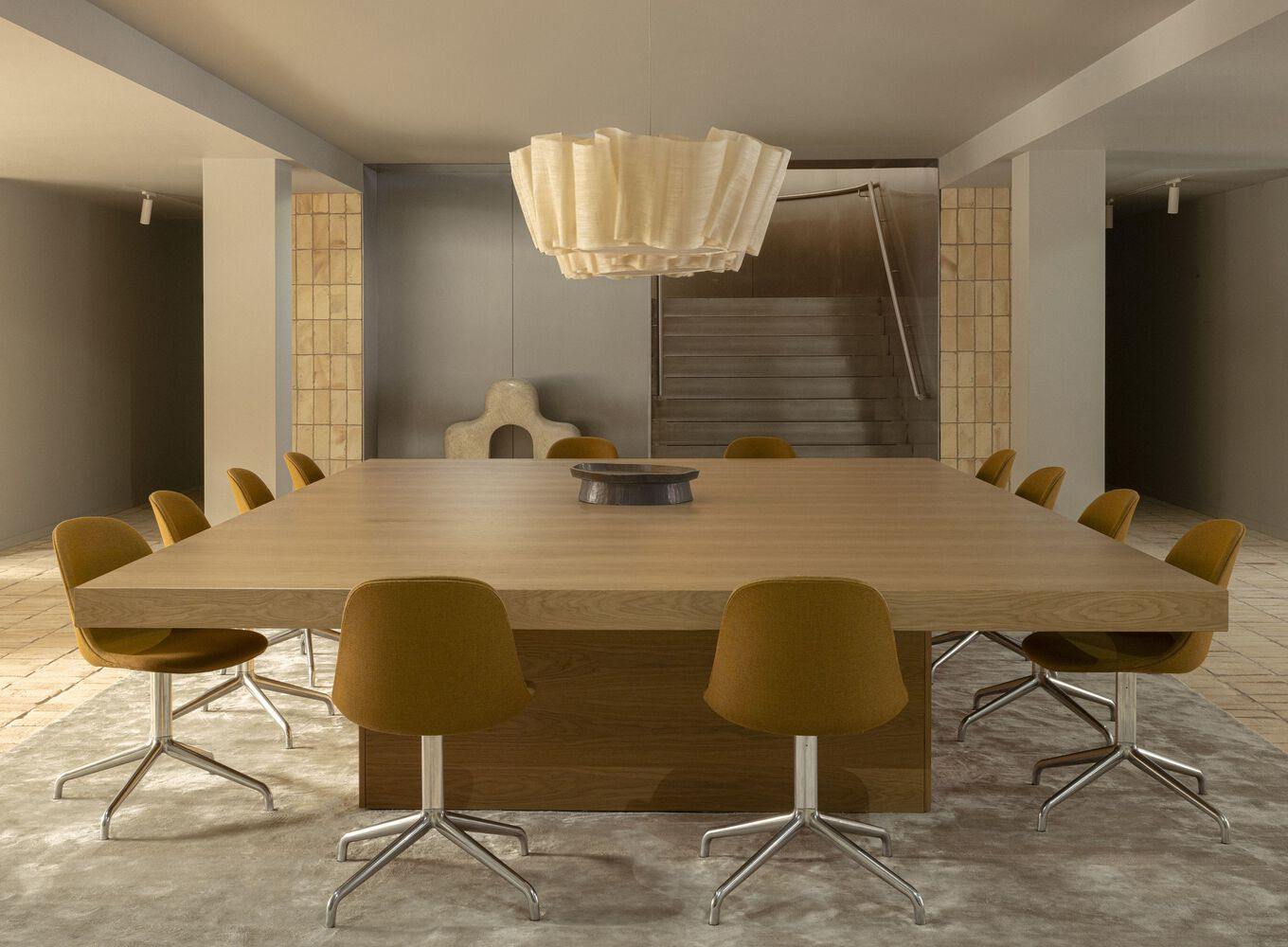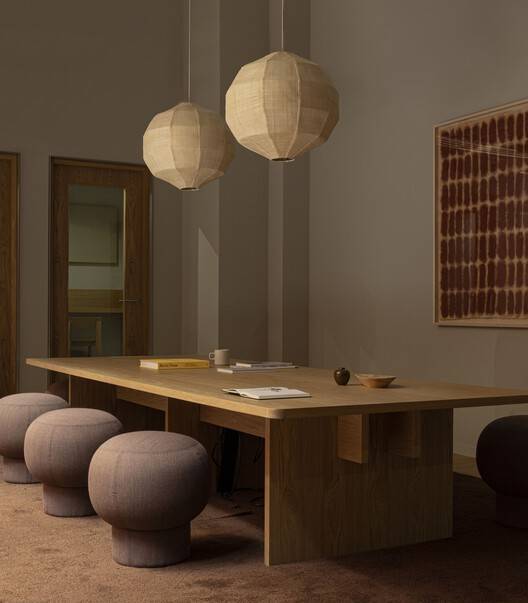 正是在接待区,我们对建筑的想法与精心策划的元素和材料充分结合在一起,在当地环境中产生了舒适感和基础感。所有这些都位于庭院之间,带来了绿地和充足的自然光,我们精心地将室内与室外融为一体,而木屏风和舒适的座椅则为工作、交流和享受创造了轻松的区域。在这里,我们展示了我们对幸福设计的看法;这不是关于最大限度的表达和戏剧性的设计特征,而是关于在室内创造一种舒适的平衡,与我们所有的感官对话。舒适的座位安排分散在一楼,营造了一个轻松的公共环境,支持工作、联系和休闲时刻。这些区域旨在容纳重点工作会议和休闲互动,在工作空间内培养平衡感和适应性,这是办公室小组存在的核心。木质屏风墙巧妙地放置在一楼的公共工作区周围,营造出温暖而诱人的氛围,在不牺牲空间开放、公共精神的情况下营造出一种封闭感。由Norm Architects为Labofa设计的舒适办公椅环绕着整个房间的长公共桌子,形成了一个舒适与生产力相结合的环境。当人们围坐在桌子旁进行头脑风暴、构思或只是平静地工作时,这个空间提供了完美的环境,以风格和便利的方式支持他们的努力。这是一个思想自由流动、舒适与功能融为一体的地方。认识到自该建筑最后一次出现以来,工作世界已经发生了变化,Chancery House有意识地进行了开发,为人们在工作场所的时间和地点提供了真正的选择。