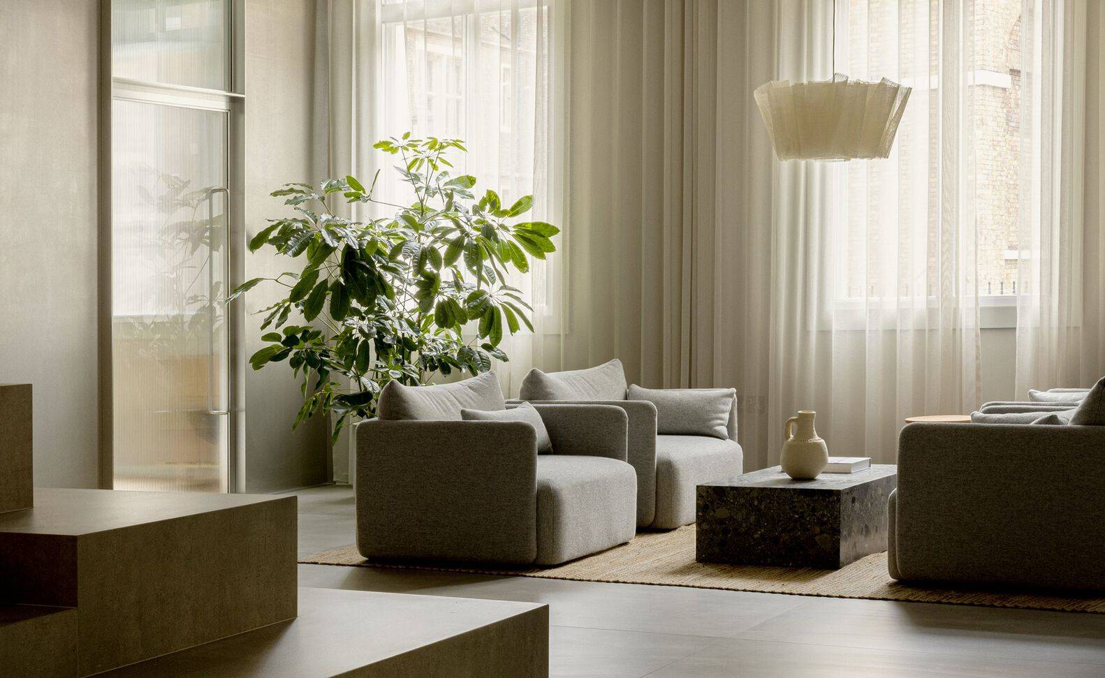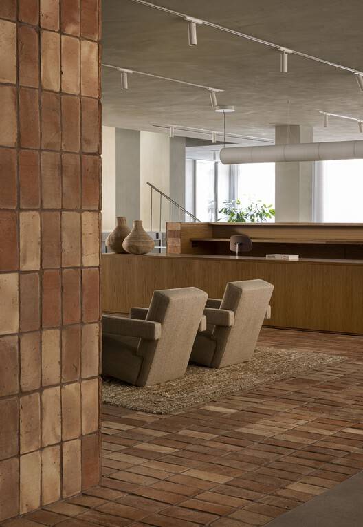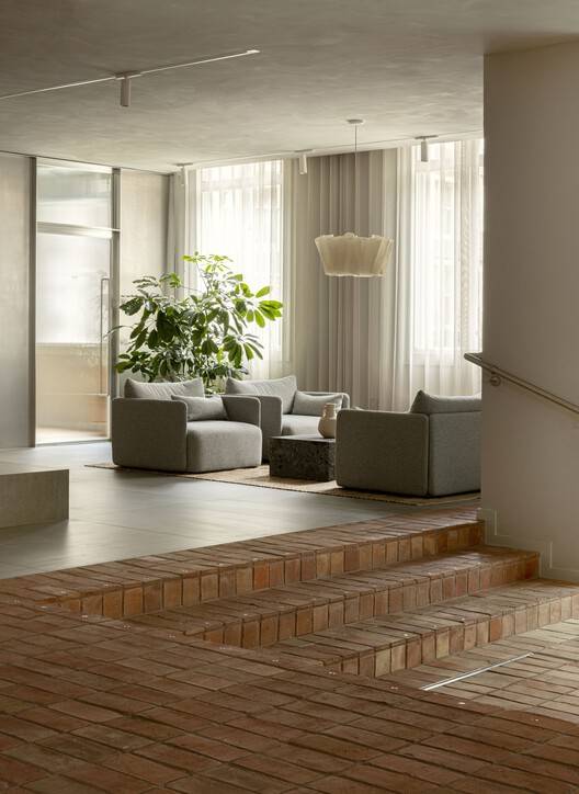 We believe that the essence of designing for well-being lies not in grandiose expressions or ostentatious features but in cultivating a harmonious environment. To achieve this, we've harnessed the power of natural forms, materials, and colors to construct spaces that not only look and feel good but also stand the test of time. The interplay of soft and hard materials, like the fusion of textiles and bricks, creates a space that not only stimulates the user but also radiates a welcoming warmth, essential for both work and relaxation within the confines of the space. The result is a curated interior akin to a mesmerizing miniature painting of the urban context, allowing you to feel the character of the neighborhood without having even left the house. Each brushstroke of design and every carefully chosen element come together to create a workspace that caters to a plethora of needs – be they functional as well as aesthetic, while embodying a harmony between design and environmental responsibility. By reducing design to its essentials and by being intentional about its sensorial impacts, we introduce a much-needed stillness to our cluttered, modern environments and hurried lives. This is just as important in our work environment as in our homes. So, when favoring a neutral palette derived from natural materials, we aim to create timeless and calming designs that provide an immediate sense of comfort and highlight details of warmth, tactility, and quality by working natural light and shadow, pleasant sounds smell and air, relatable forms and voids as well as comfortable spatial flows, we engage with sensibilities that are universal, not bound by culture or geography. This way, we hope to speak to all users and remain relevant for many years to come.