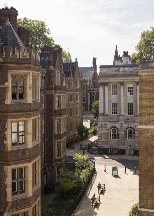 Spread across most floors, you'll find meeting rooms of different characters and sizes. These are all places for important decisions to be made, ideas to be shared, and collaborations to be strengthened. Moreover, having a quiet environment with minimal distractions helps the team focus and be more productive. Light curtains and lush carpets aren't just decorative, they help frame the interior while improving the acoustics, which is even more important today when people tap into meetings from all over the world. A great deal of care was taken to size and position spaces correctly, break down the scale, and offer a huge range of workspace options so that users are constantly able to change the way they work, or find a particular space that suits them. Looking down towards the building, you'll see how dMFK Architect's reconfiguration of the building has secured open-air terraces on several levels to ensure that there's always somewhere alfresco to retreat to for a mind-refreshing change of scene – while also providing an abundance of natural daylight inside. The harmonious connection between the interior and exterior is a testament to the meticulous attention to detail and the successful collaboration between dMFK Architects and Norm Architects. In essence, the inside and outside of Chancery House are truly intertwined not just through the choice of materials but also through a profound narrative of collaboration and design finesse, creating an atmosphere that is both visually stunning and deeply meaningful.