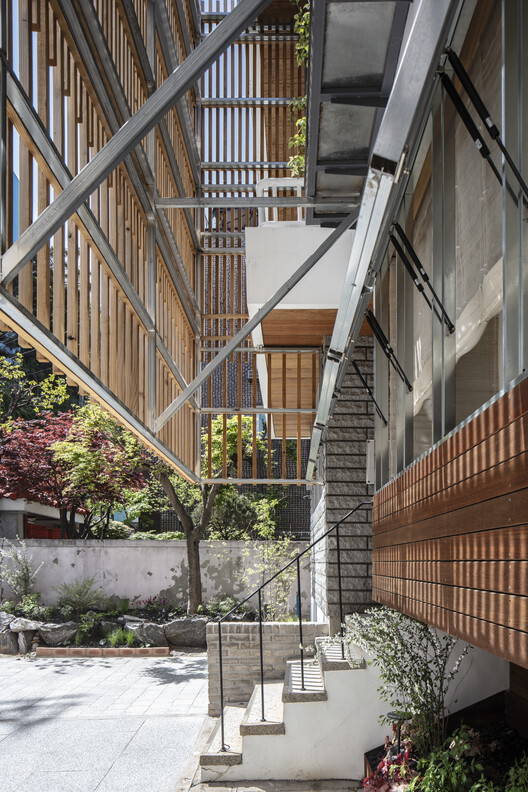 The most important point was to symbolize change and a new beginning without making too many changes to the house filled with memories. In particular, when viewed from the front street, it forms a sentimental landscape with the adjacent single-family house, so we did not want to damage the surrounding context. In order to preserve the scale and emotion of the street as much as possible, the façade structure was made of wood rather than modern materials, and the volume was applied to the right side of the building opposite the adjacent single-family house. The double wooden skin serves as a screen that controls the south-facing sunlight of the first-floor tea room while ensuring the privacy of the second-floor studio.