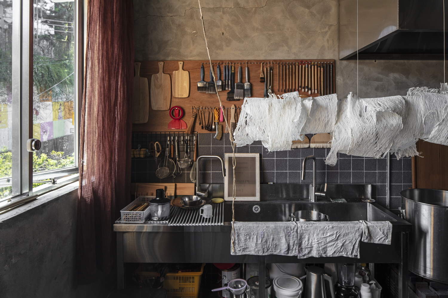 The second-floor studio is a raw space. All the walls are exposed here, and traces of the gable roof that has undergone several constructions remain. The old, collapsed wooden floor frame was reinforced and recast, and finished with high-strength tiles suitable for work. The studio is largely composed of a molding room, a dyeing room, and a sewing room, and the molding room was planned as a greenhouse-type space suitable for drying and molding paper and fabric.