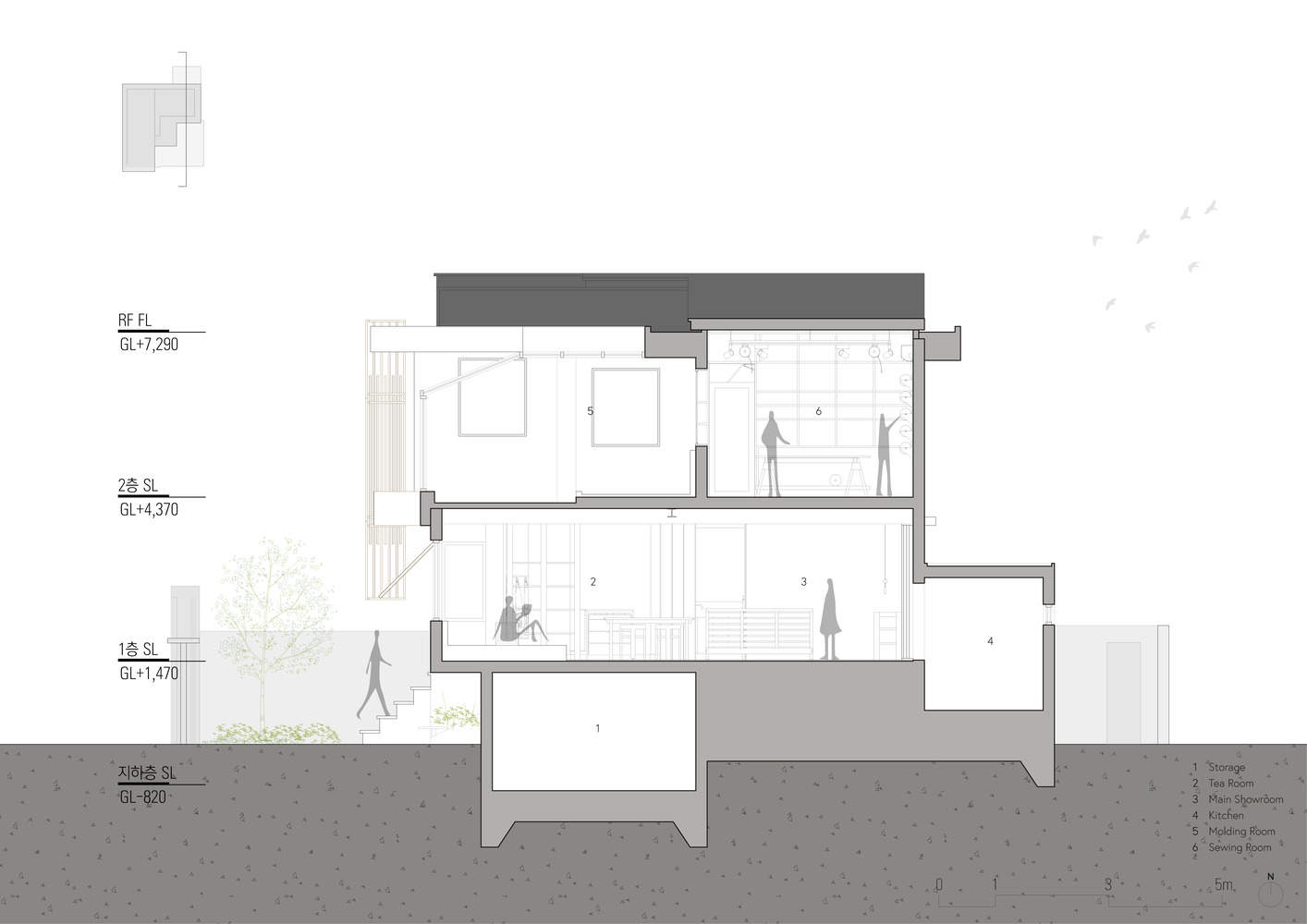 The first-floor showroom was planned as an open space with only the minimum walls necessary for spatial division. Each area is divided into a tea room, a living room, and two exhibition spaces with different concepts. The finishing materials of the showroom were carefully selected to harmonize with the artwork. The main space from the main entrance to the living room is constructed with granite in a wide Korean style and finished with fumigated wood with a prominent texture and spray paint. Fabrics woven and produced by the artist on a loom are installed throughout the space to amplify the oriental feel of the space. Some walls and ceilings exposed without finishing materials show the building's old exterior along with its history and structure.