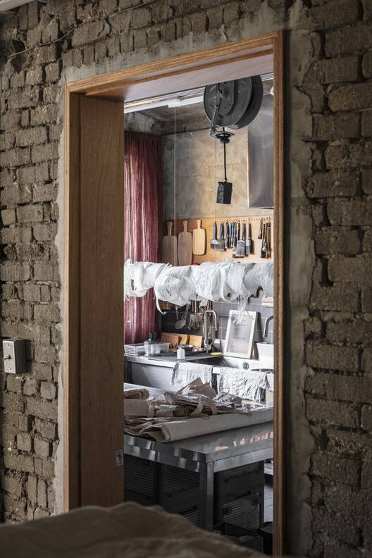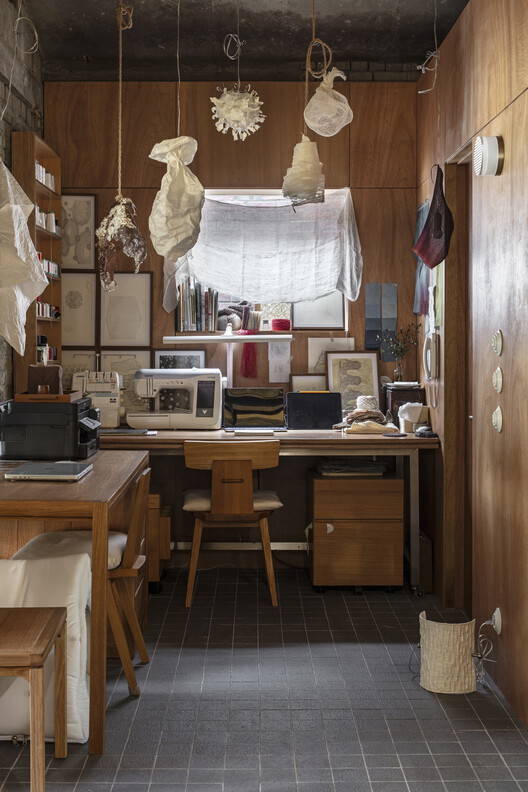 二楼的工作室是一个原始空间。所有的墙壁都暴露在这里,经过几次建造的山墙屋顶的痕迹仍然存在。旧的倒塌木地板框架经过加固和重新铸造,并铺上了适合工作的高强度瓷砖。工作室主要由一个成型室、一个染色室和一个缝纫室组成,成型室被规划为一个适合干燥和成型纸张和织物的温室式空间。