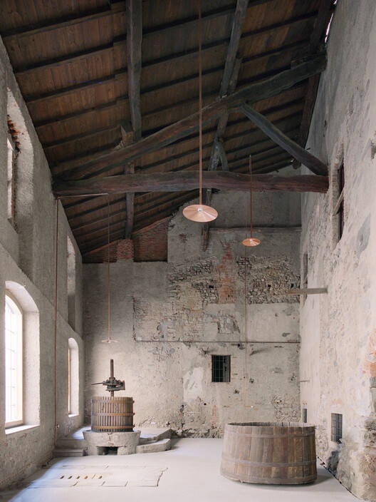 Text description provided by the architects. A large space, located inside a historic Italian villa in Brianza and built on an ancient Roman "castrum," has been abandoned for decades, only to be used as a storage. This space, adjacent to a church and the entrance to the villa, has now been converted into a multipurpose space for events and exhibitions. A hidden gem of rare beauty that recalls a typical craft in Brianza, that is viticulture and grape pressing. An almost mystical and sensory space that evokes and brings back to life an ancient way of working and living.