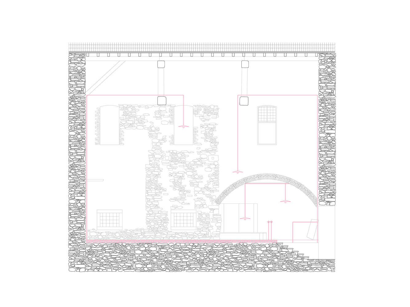 The idea of "lightness" guided us in the choice of materials: a concrete pavement defines a new layering, flanking and at the same time receding from the masonry, following the irregular stone pattern of the walls, and forming a darkening demarcation between new and existing areas.