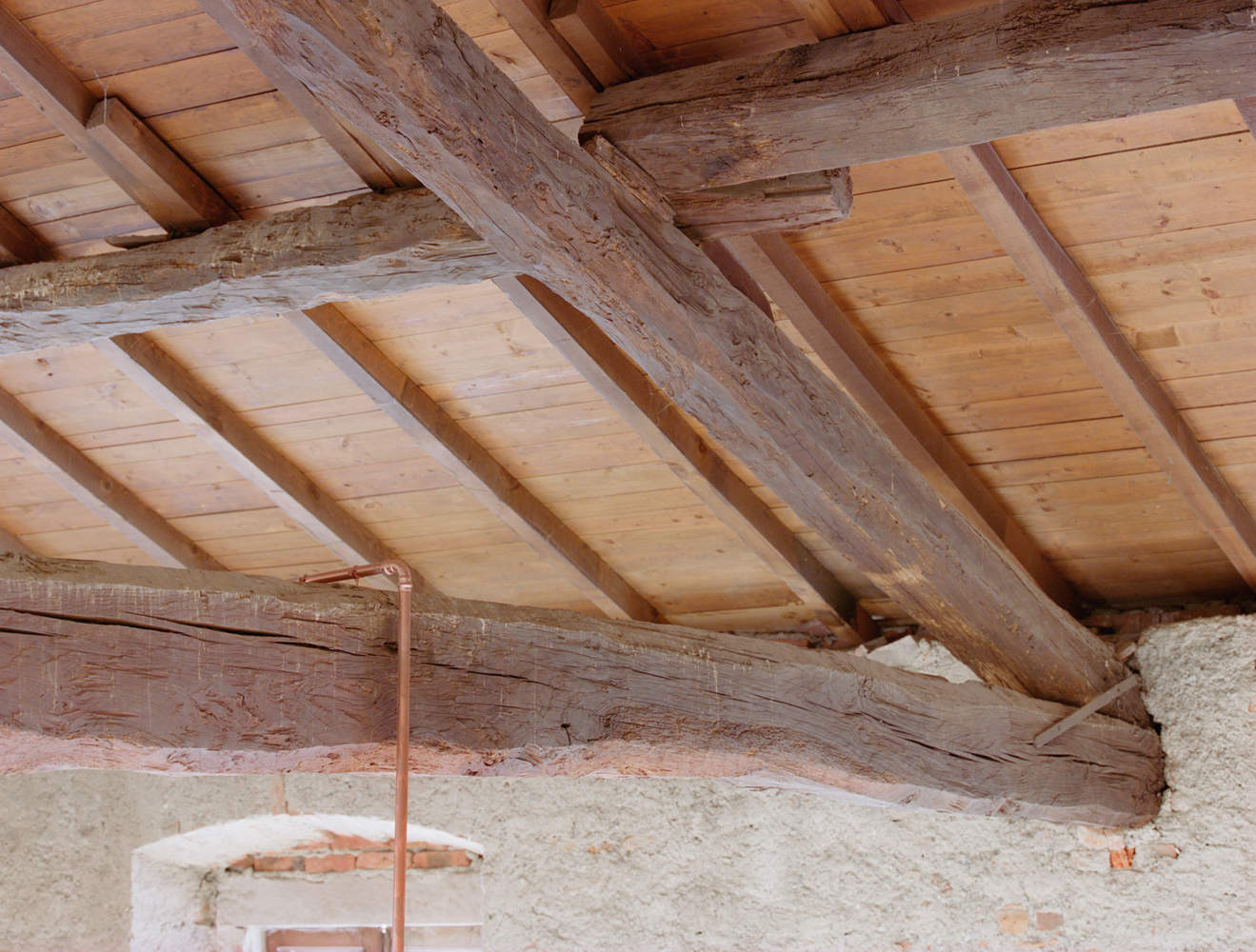 The plasterwork of what were once the building's exterior walls, the wooden elements of the balconies, and the dressed stones are clearly visible. The layers on the masonry have been left visible, instead of disappearing behind a layer of new plaster or being removed, to tell the story of the place and its different uses over time.