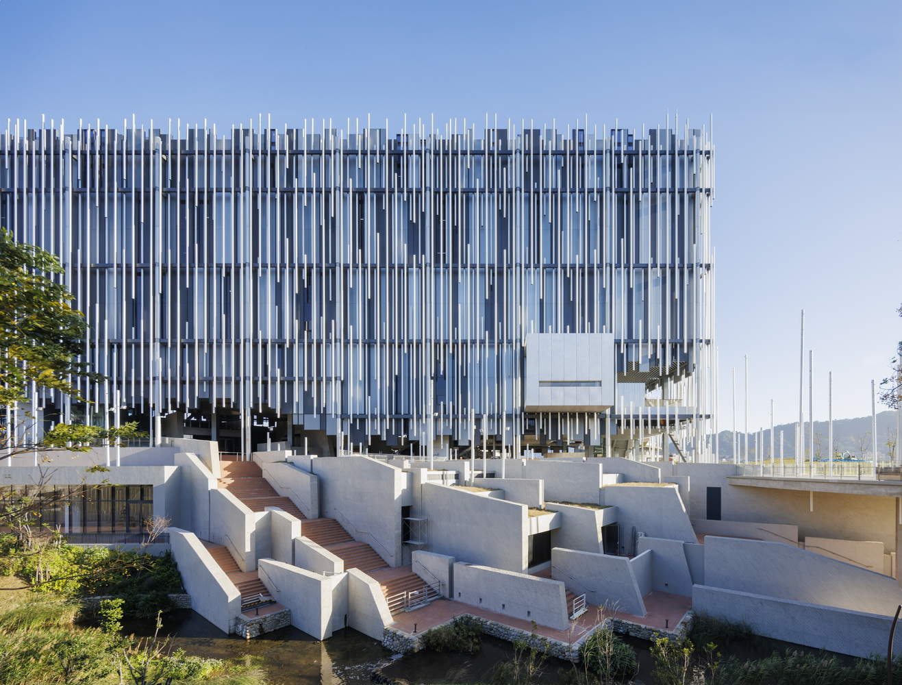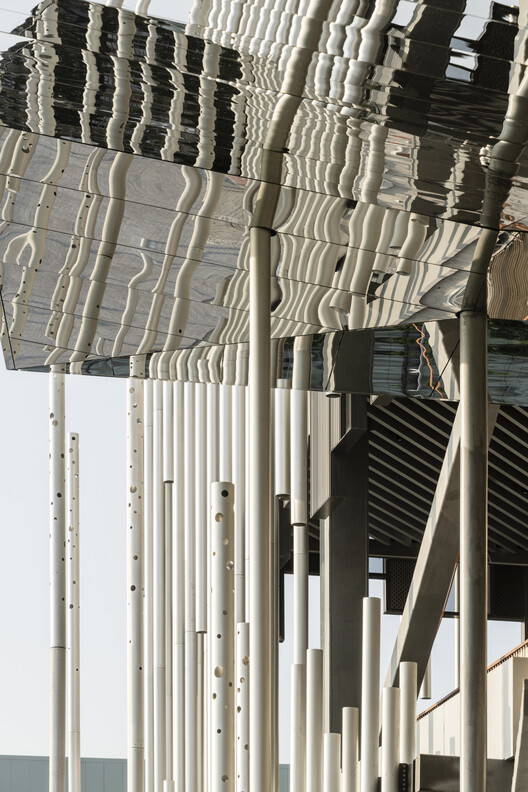 The design intelligently blends the natural and the fabricated, interpreting elements of one in the form of the other, and vice versa. The distinctive façade is composed of a series of sandblasted aluminum tubes of varying heights and lengths, paired with vertically segmented three-color aluminum panels arranged in a staggered manner. From afar, this linear screen conjures the blurry beauty of reeds swaying in the wind, concealing the solid exhibition box that so often suggests a building of its typology. It cleverly mirrors the ever-changing natural environment and landscape on the facade, attracting people with its unique architectural appearance to visually experience the fleeting changes in the vastness.