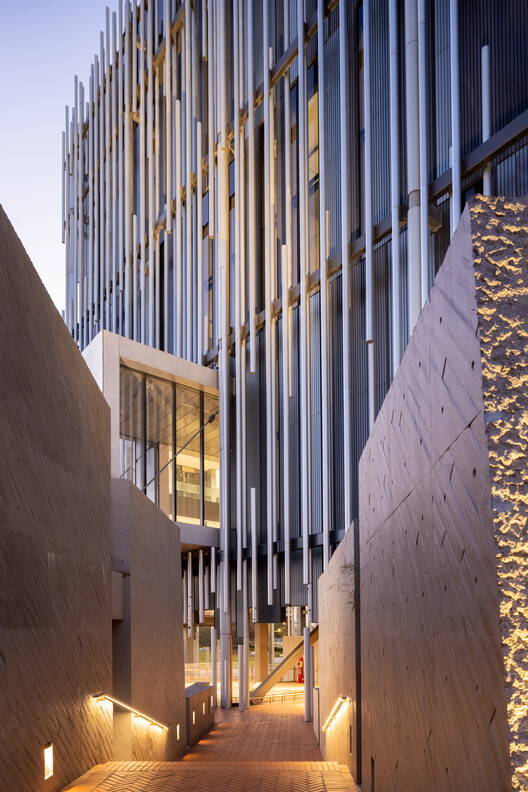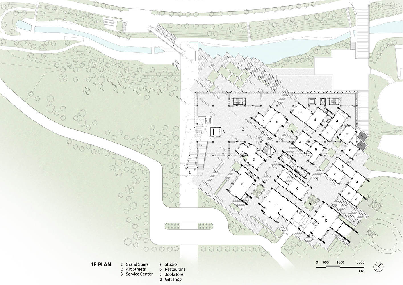 这个开放的艺术村采用了一种原始的混凝土材料,展示了大汉江侵蚀形成的地理类型。建筑混凝土墙的特点是对角线排列的雪松木板所留下的纹理,与顶部和侧面的粗糙凿刻表面形成鲜明对比。坚固的颗粒状混凝土墙和砖砌路面创造了一个蜿蜒而动态的空间布局,建立了一个与自然交织的艺术空间。