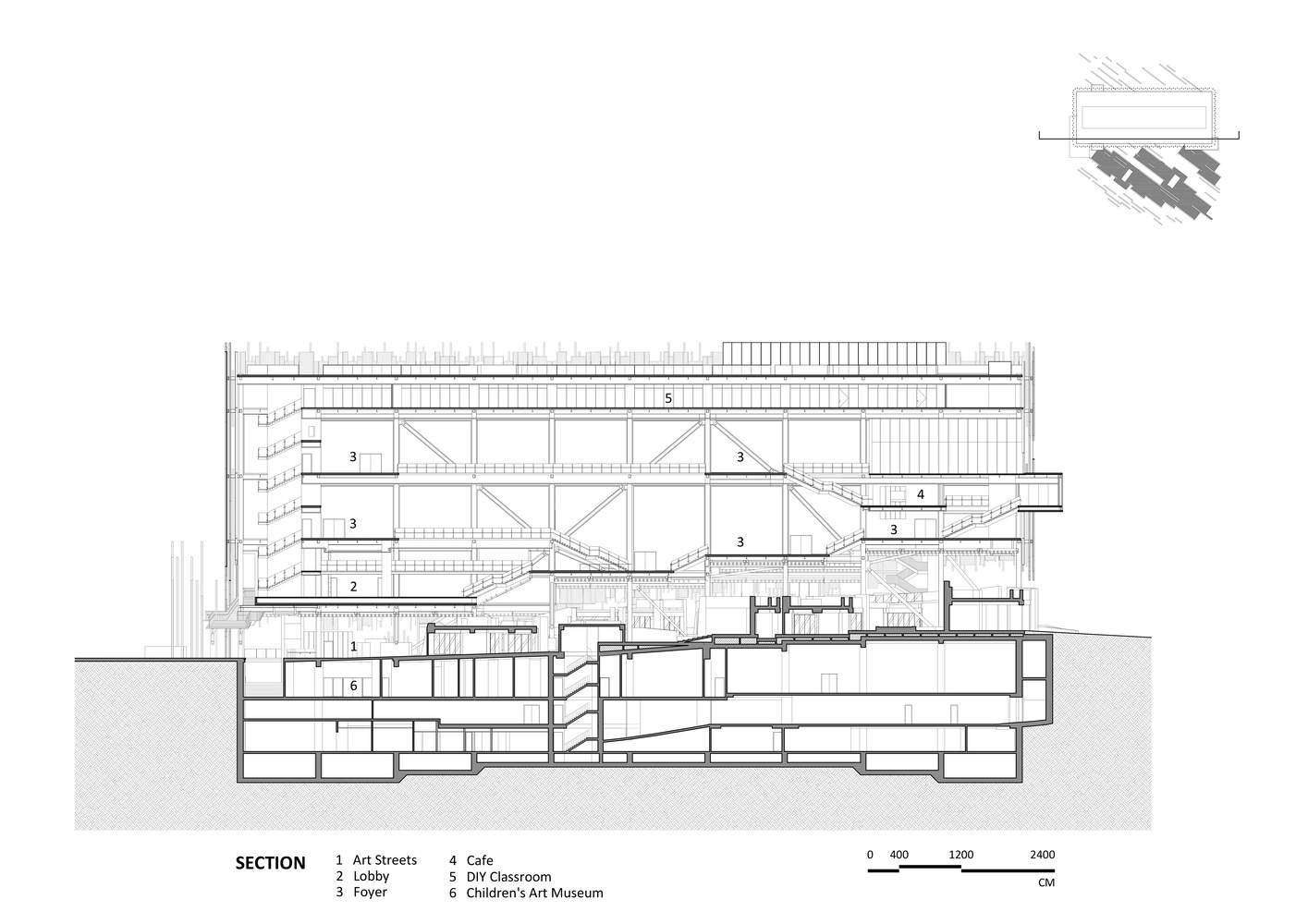 在地面上,清水混凝土艺术村展开,展现出一个由艺术街道和雕塑露台组成的网络。这座新博物馆遵循了“向所有人开放”的博物馆理念。游客可以在露天露台上自由漫步,露台上排列着咖啡馆、工作室和餐馆,其空间布局与莺歌和三峡的老街相同。他们还可以参加各种艺术活动,驻足欣赏开放式装置,或沿着砖砌路面走到山顶俯瞰风景。