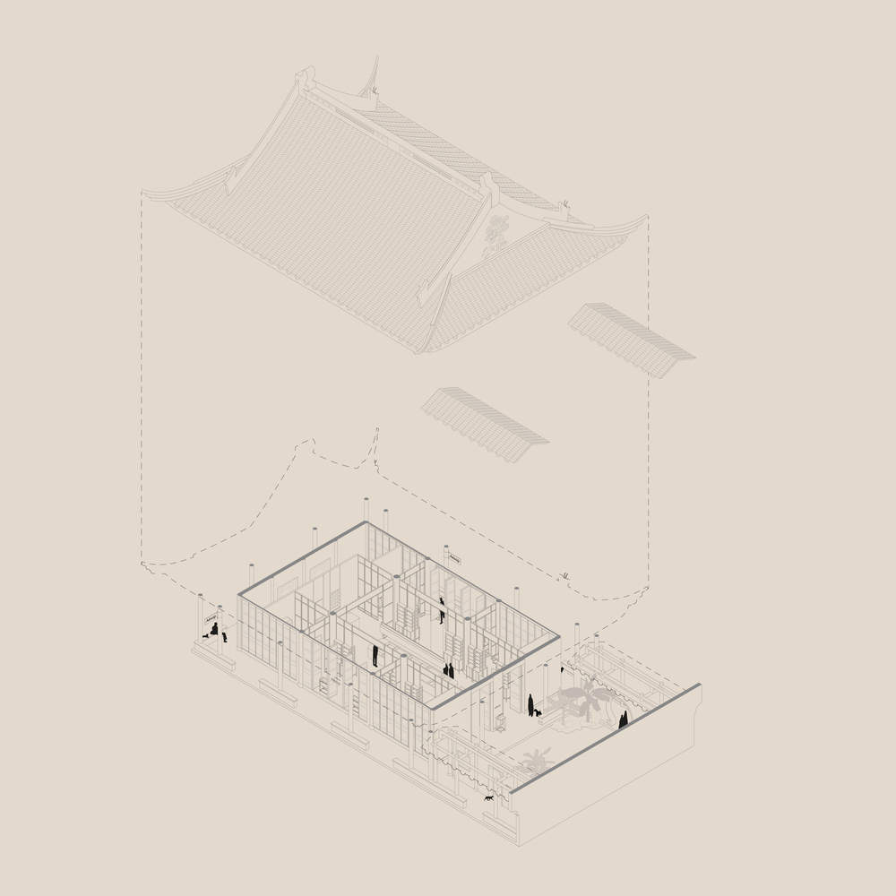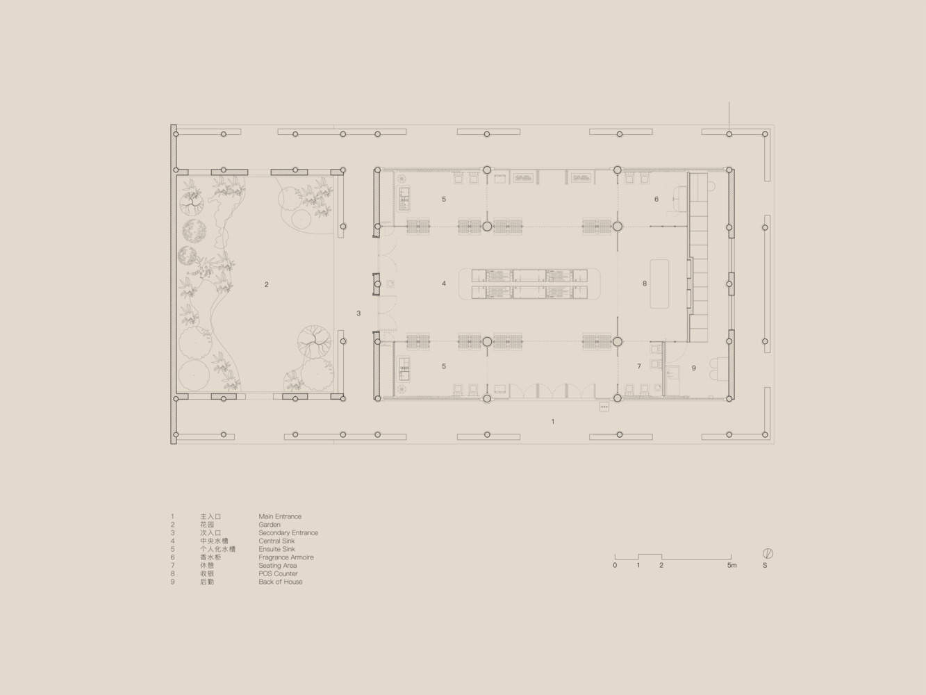 The design's core concept revolves around reimagining the space within the constraints of traditional architecture. The goal is to seamlessly integrate modern functions while crafting Aesop's distinctive, brand-centric spatial experience. Inspired by conventional garden architecture, the spatial division draws inspiration from the concept of "shade", a typical design element that partitions the space into a central "hall" and surrounding "rooms". The "hall", an open space, fosters social interaction and imbues the space with a sense of ceremony. In contrast, the "rooms" offer a more private and enclosed experience. This duality of spatial qualities perfectly aligns with Aesop's spatial requirements.