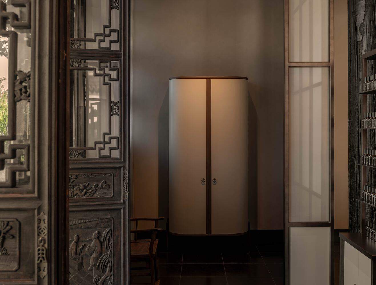 在“大厅”的中心,一盏裹着丝绸的现代灯笼轻轻照亮了这个空间。灯笼上装饰着苏绣,这是四种主要的传统刺绣技术之一,它变成了苏绣艺术家精湛刺绣的画布。受清代画家樊琦绘画的启发,一幅姑苏画卷在空中优雅地展开,讲述着江南的温柔故事。在“房间”深处,一个优雅的香水衣橱,像一个神秘的宝库一样召唤着人们去探索。橱柜门由细长的支架优雅地支撑着,并配有精致的铜环把手,与清朝的传统家具相呼应。精心挑选的古董家具散布在整个空间中,减少了我们对新资源的依赖,为这些珍贵的家具注入了新的活力。