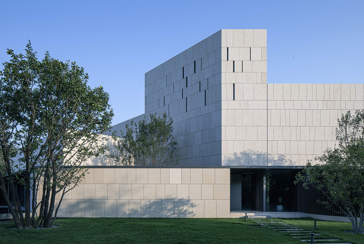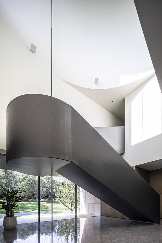 The second strategy involved creating an inner courtyard by selectively reducing interior floor area, to enhance engagement with nature. Lastly, the third strategy introduced new courtyard walls, linking previously scattered sections of the building and wrapping external nature into the interior. In this way, the building's boundary is deliberately blurred, allowing for a seamless integration with the surroundings. The upper portion of the building follows the original layout, divided into two distinct areas: a communal area, and a more private guestroom area, with an open-air badminton court positioned in between. The rooftop adds significant value, offering diverse vantage points and spatial experiences. A striking outdoor staircase and ramp in the middle section serve not only for fire evacuation but also connect the upper floors directly to the ground, allowing for varying views as one moves up and down, encouraging immersion in nature. The exterior is finished with beige stone, conveying warmth during cold northern winters and aligning with the owner's vision. The solid walls also resonate with the region's character.