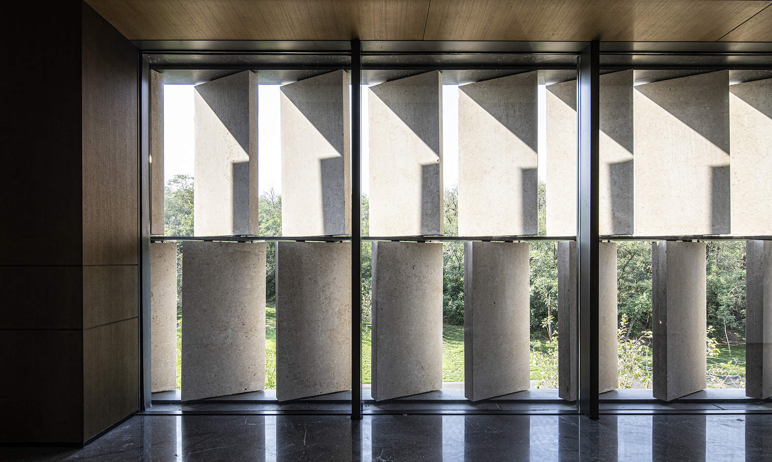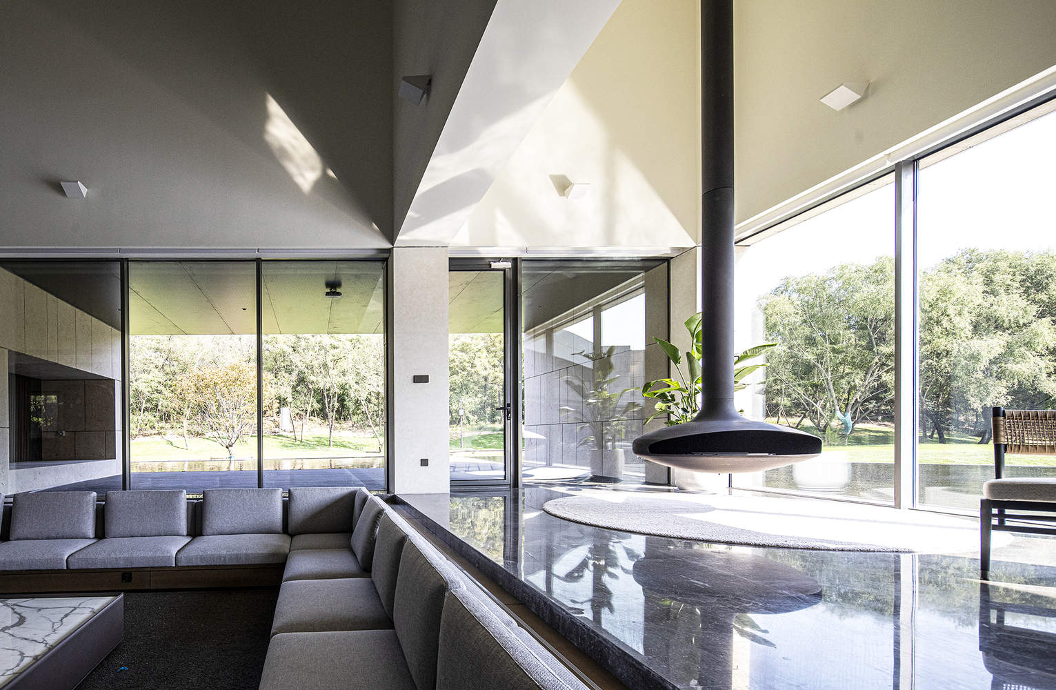 翻修旨在打破孤立和封闭的立面,促进室内空间与风景如画的周围环境之间的密切关系。通过重新组织室内布局,该设计引入了一种清新的度假生活方式,尽可能地将自然带入室内。为了提高空间灵活性,现有的柱网被视为一个有序的框架。在这个网格中,结构柱要么隐藏在隔墙内,要么故意暴露在外,创造了一种开放性和结构连贯性的新平衡。为了加强建筑与周围环境的联系,翻修中采用了三种主要策略。首先,在现有混凝土框架结构的基础上,设计团队拆除了一楼的外部填充墙,统一了内部天花板高度,并将天花板向外延伸,形成了一个悬挑雨棚。天棚在整个建筑中建立了一条水平线,将上面的实心石墙与通风、透明的下部形成对比。在这条线之上,坚固的石头立面强调了结构的体积,而下面的空间则以更高的透明度向景观开放。突出屋檐下的透明玻璃立面成为一个抽象的景观带,捕捉周围的环境。从延伸的悬垂屋檐下看,远处分散的自然景观呈现出有序的抽象,形成了周围荒野的凝聚力。