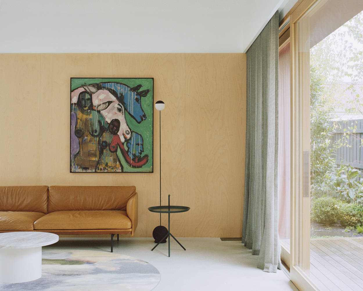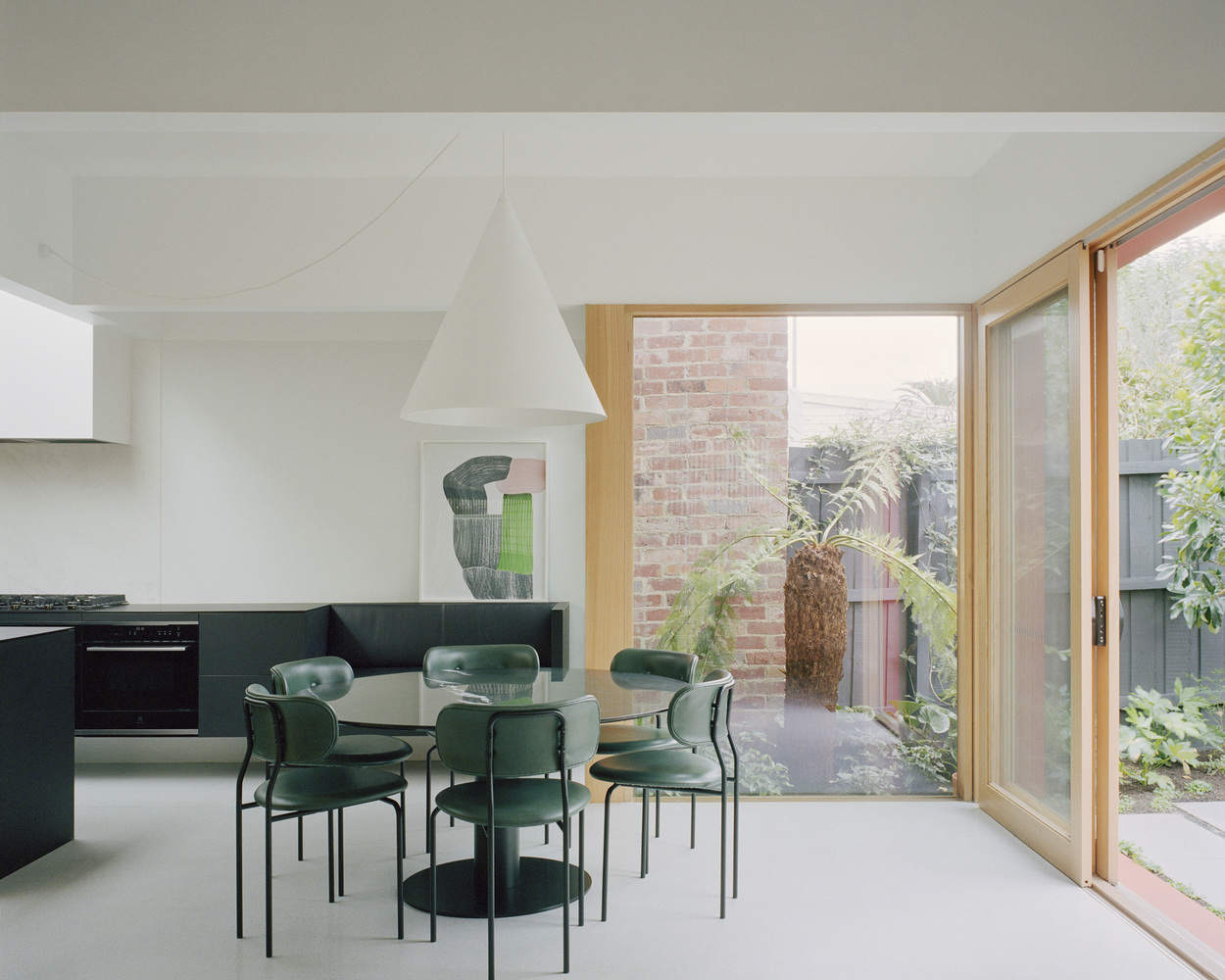 The materials and finishes are applied in blocks of texture and color to define different elements or sections of the house. The existing house is divided into two – a light volume for kids bedrooms and study, and a darker 'moody' volume housing the main bedroom/ensuite and the corridor connecting to the new extension. The new spaces are much brighter and more stripped back, with a combination of the terrazzo floor, plywood joinery and walls and two minimal black kitchen cabinets. Externally, the new addition is distinguished from the old house with a combination of dark cladding and a series of the deep red door reveals and fins which give the façade depth, texture and protect openings.