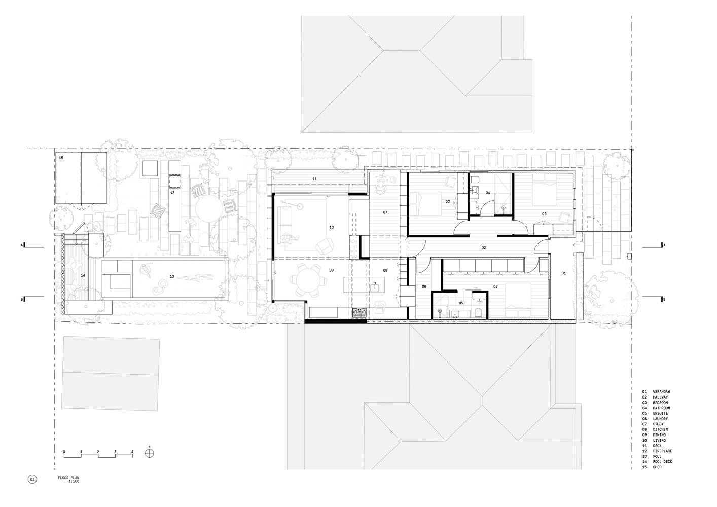 新建筑从北部边界向后延伸,以最大限度地利用自然光,并为客厅创造两个方面。在内部,扩建部分上方的格子天花板体积通过在每个“房间”上方创建一系列松散的空间,参考了现有挡风雨板房屋的蜂窝平面图。这通过在可能的情况下增加天花板高度,并在其中一个天花板空隙中添加天窗,将自然光带入房屋深处,给人一种宽敞和明亮的感觉。