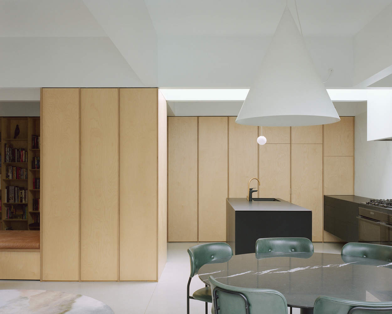 材料和饰面以纹理和颜色块的形式应用,以定义房屋的不同元素或部分。现有的房子分为两部分——一部分是儿童卧室和书房的浅色空间,另一部分是主卧室/套房和连接新扩建部分的走廊的深色“忧郁”空间。新空间更加明亮,更加简洁,水磨石地板、胶合板细木工制品和墙壁以及两个最小的黑色橱柜相结合。从外观上看,新增加的部分与旧房子不同,它结合了深色的覆层和一系列深红色的门楣和鳍片,赋予了立面深度、质感和保护开口。