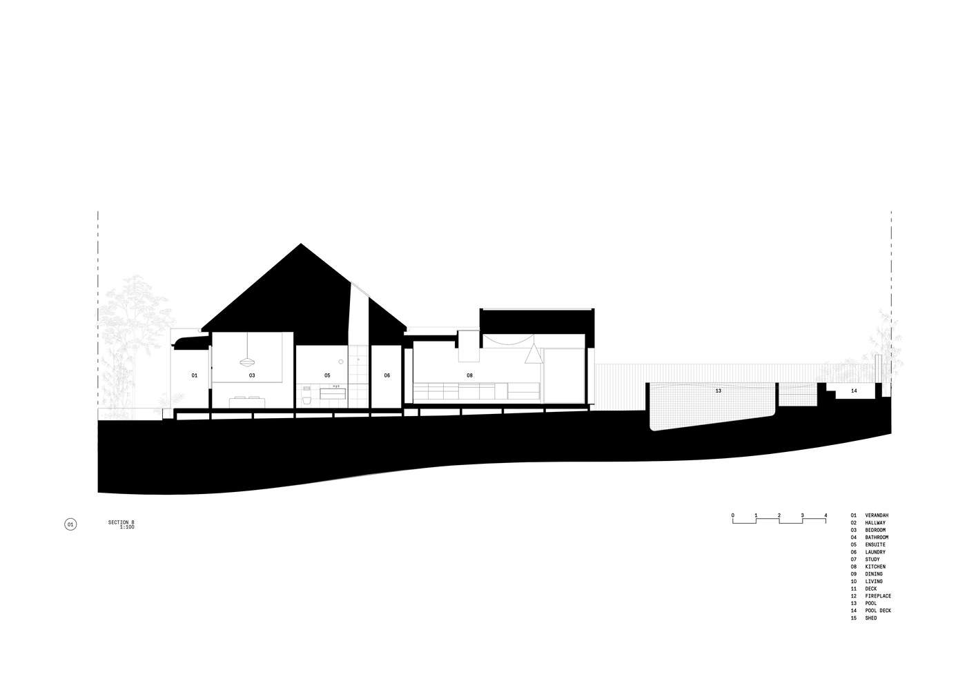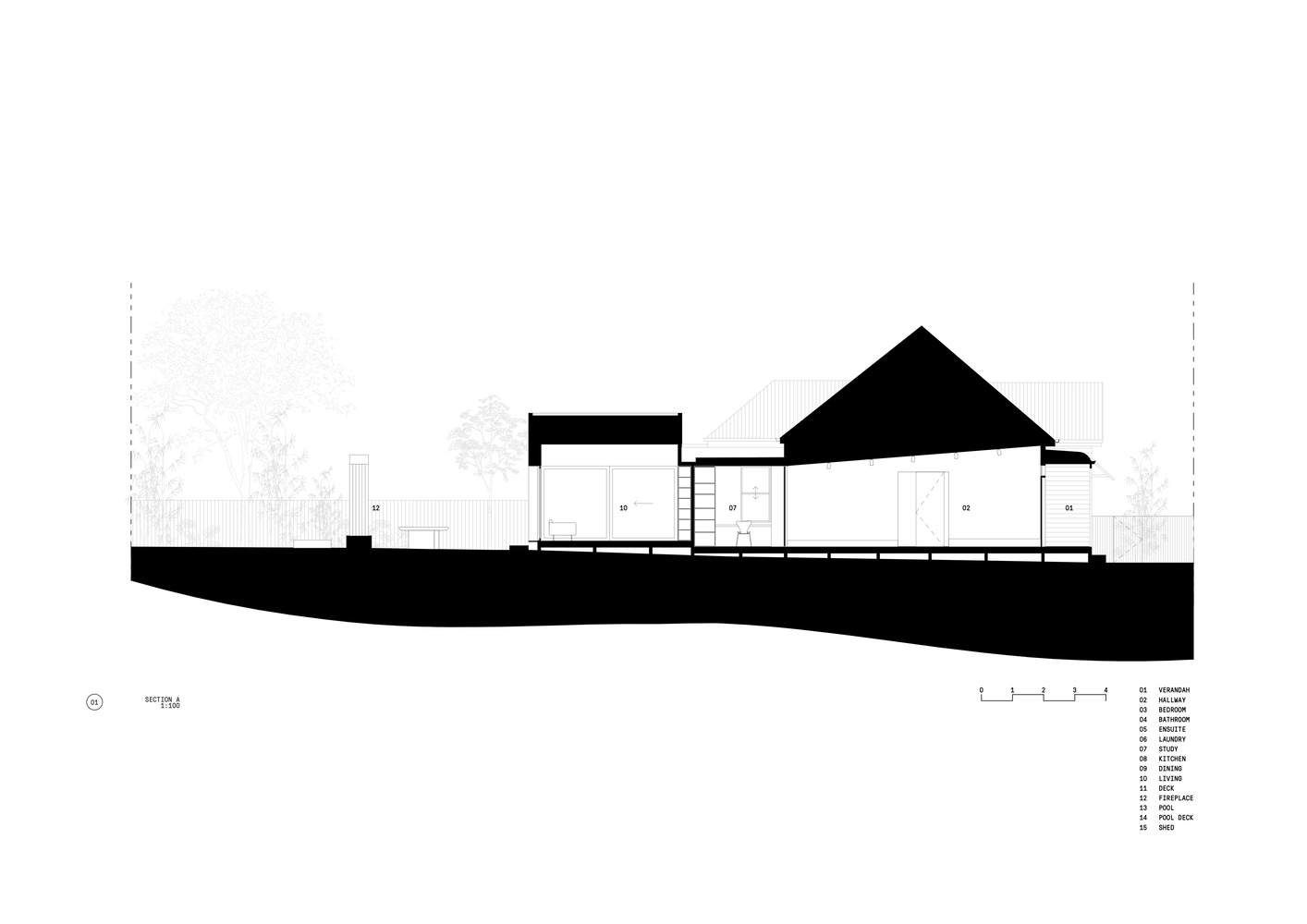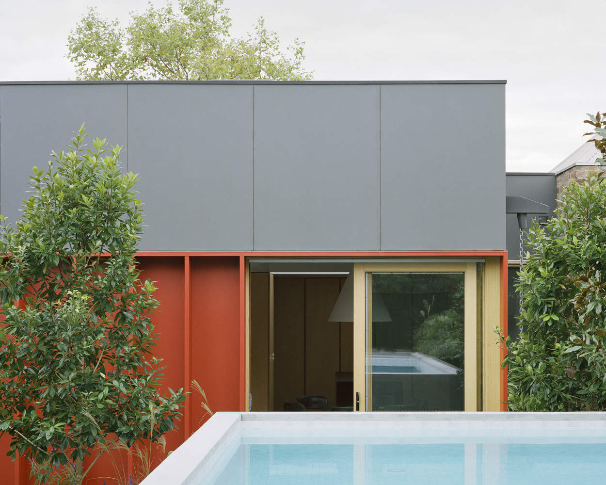 The new spaces are anchored around a storage volume housing a concealed, retractable TV and other tech and a day bed which creates a connecting space in between the study (the last room in the existing house) and the new living area. The landscape and pool continue this approach outside by overlapping different zones for planting, swimming and gathering. Mirroring the daybed and storage volume inside, the garden is punctuated by the above-ground pool, a long concrete bench and the vertical volume of a custom steel outdoor fireplace.